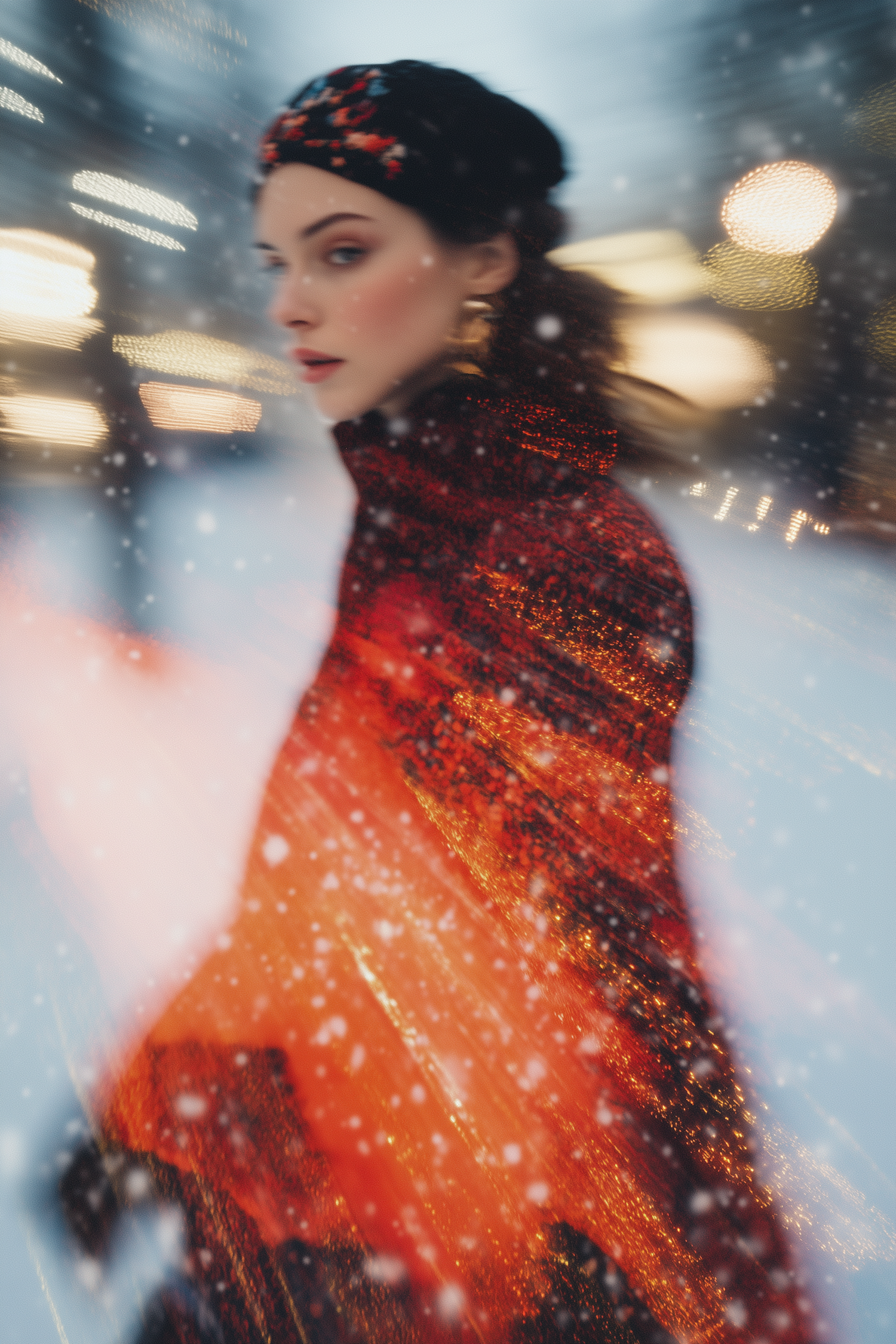 A young woman in a red coat and black beret amidst a snowy, blurred cityscape, exuding elegance and motion.