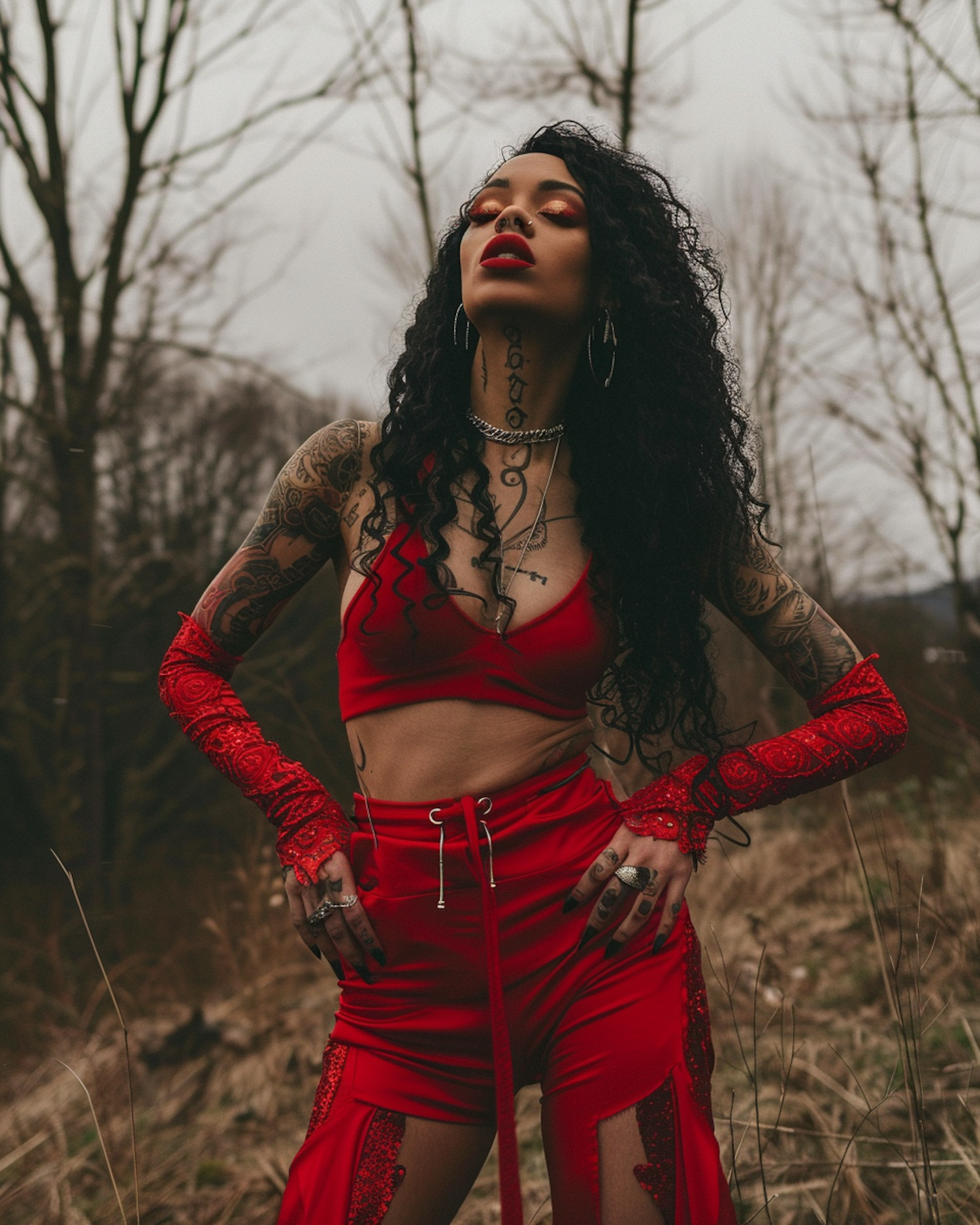 Confident woman with tattoos in a vibrant red outfit stands in a natural setting, showcasing bold style and striking makeup.
