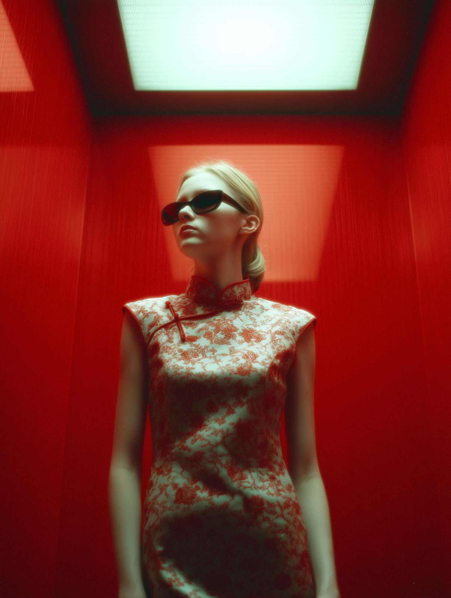 Blonde woman in a red floral qipao and black sunglasses stands in a bold red room with glowing white light, blending tradition and modernity.