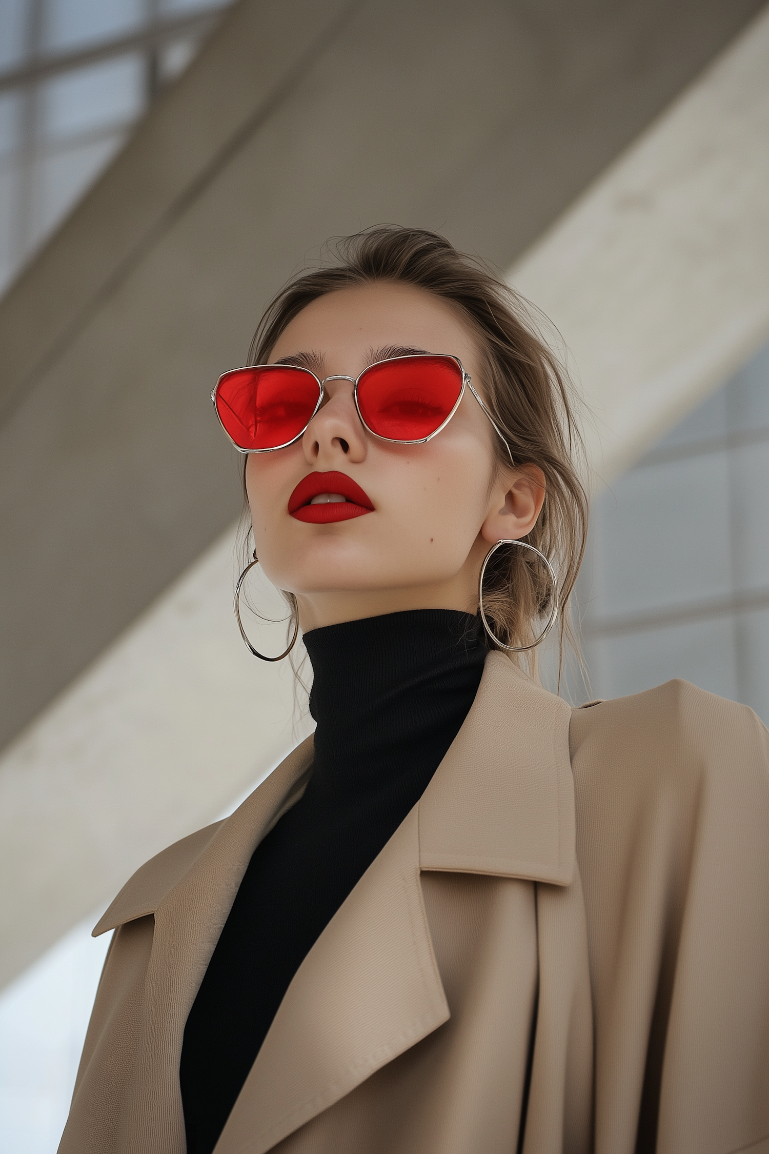 Stylish woman in red sunglasses and beige coat, exuding confidence and elegance in a modern architectural setting.