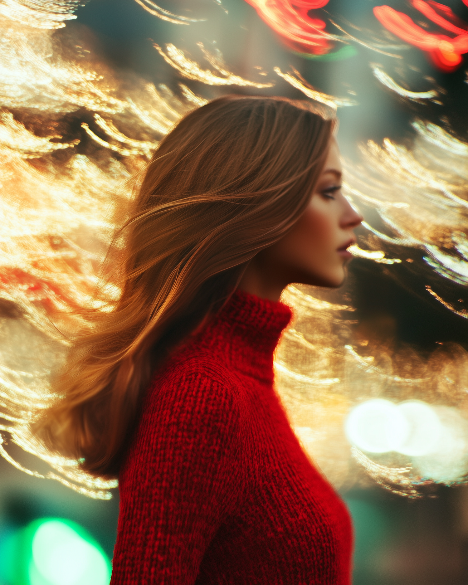 Profile of a woman in a red sweater with dynamic, swirling lights in the background, creating an artistic and vibrant scene.