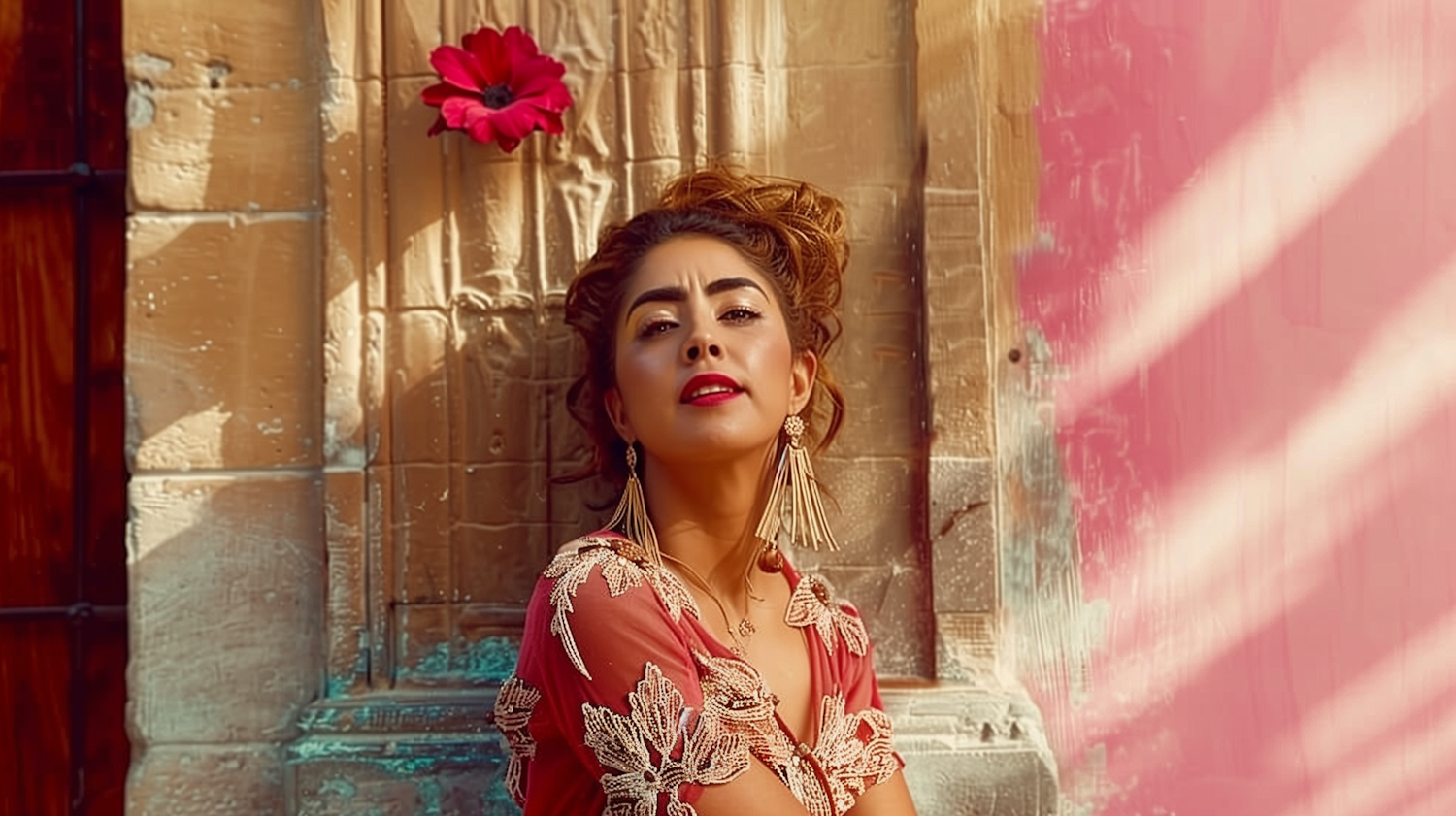 Elegant woman in embroidered pink dress with blurred face, standing against a stone wall with a red flower. Sophisticated and serene.