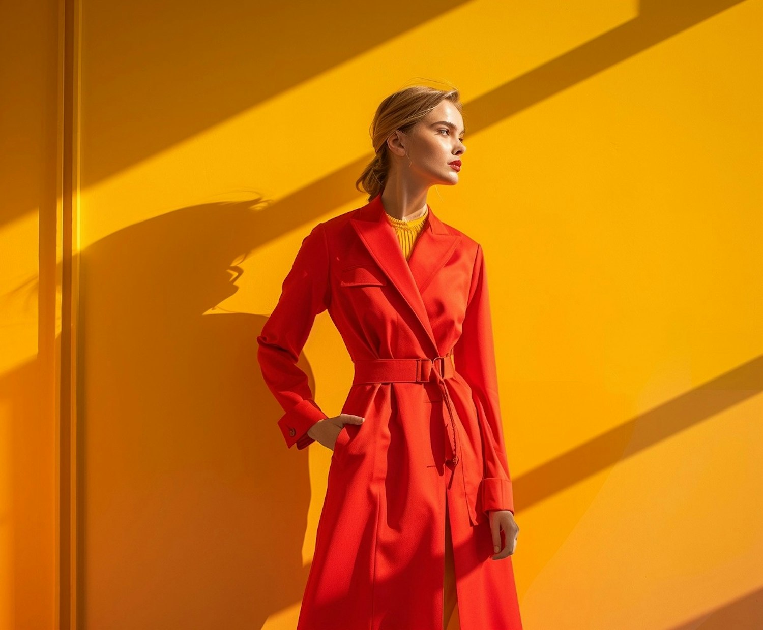 Stylish woman in a red trench coat against a vibrant yellow background, creating a bold and colorful fashion statement.