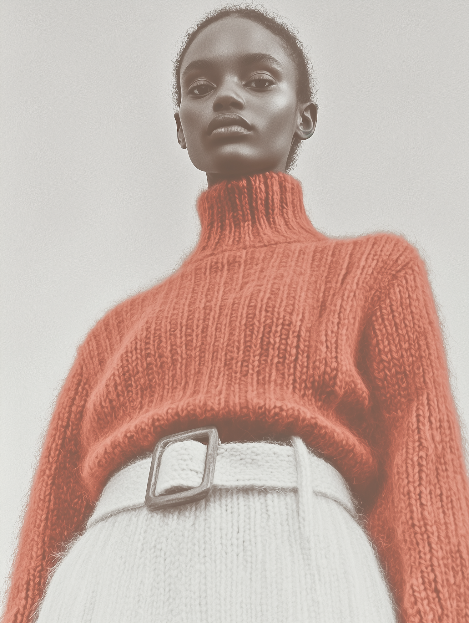 Stylish woman in orange turtleneck and cream skirt with belt, exuding confidence and elegance against a neutral background.