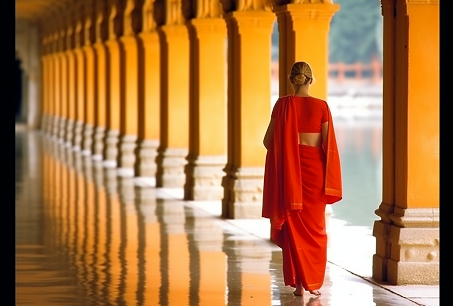 Woman in red sari walks through a corridor of orange columns, creating a serene and harmonious scene with reflections on the polished floor.