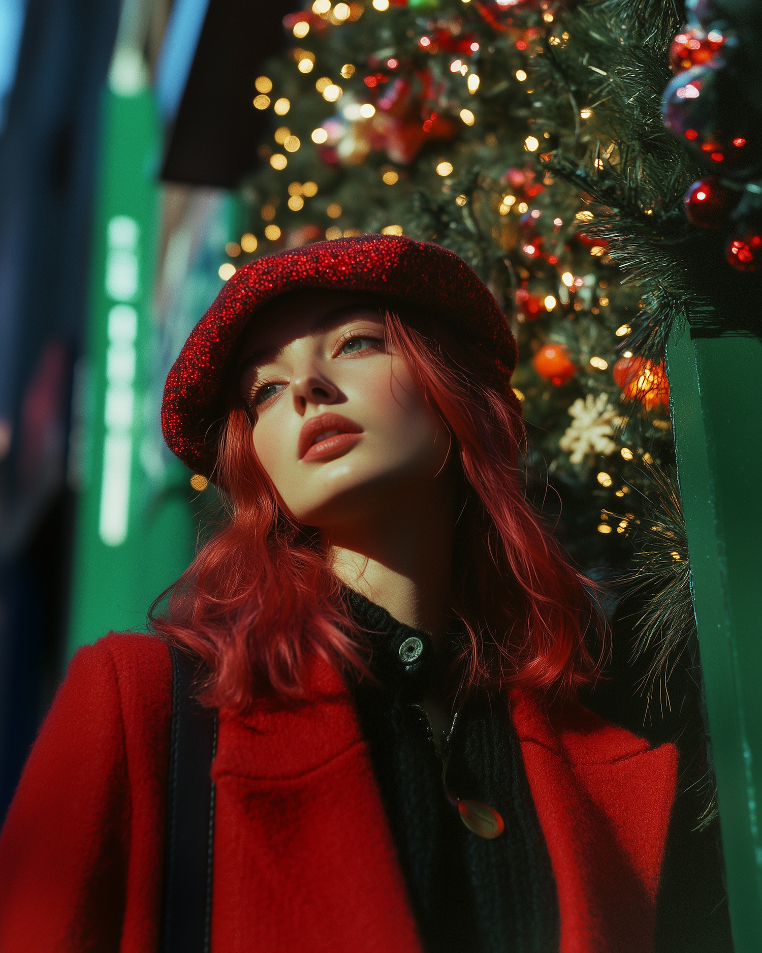 A young woman in a red coat and beret stands by a festive Christmas tree, her red hair and blue eyes highlighted by warm lighting.