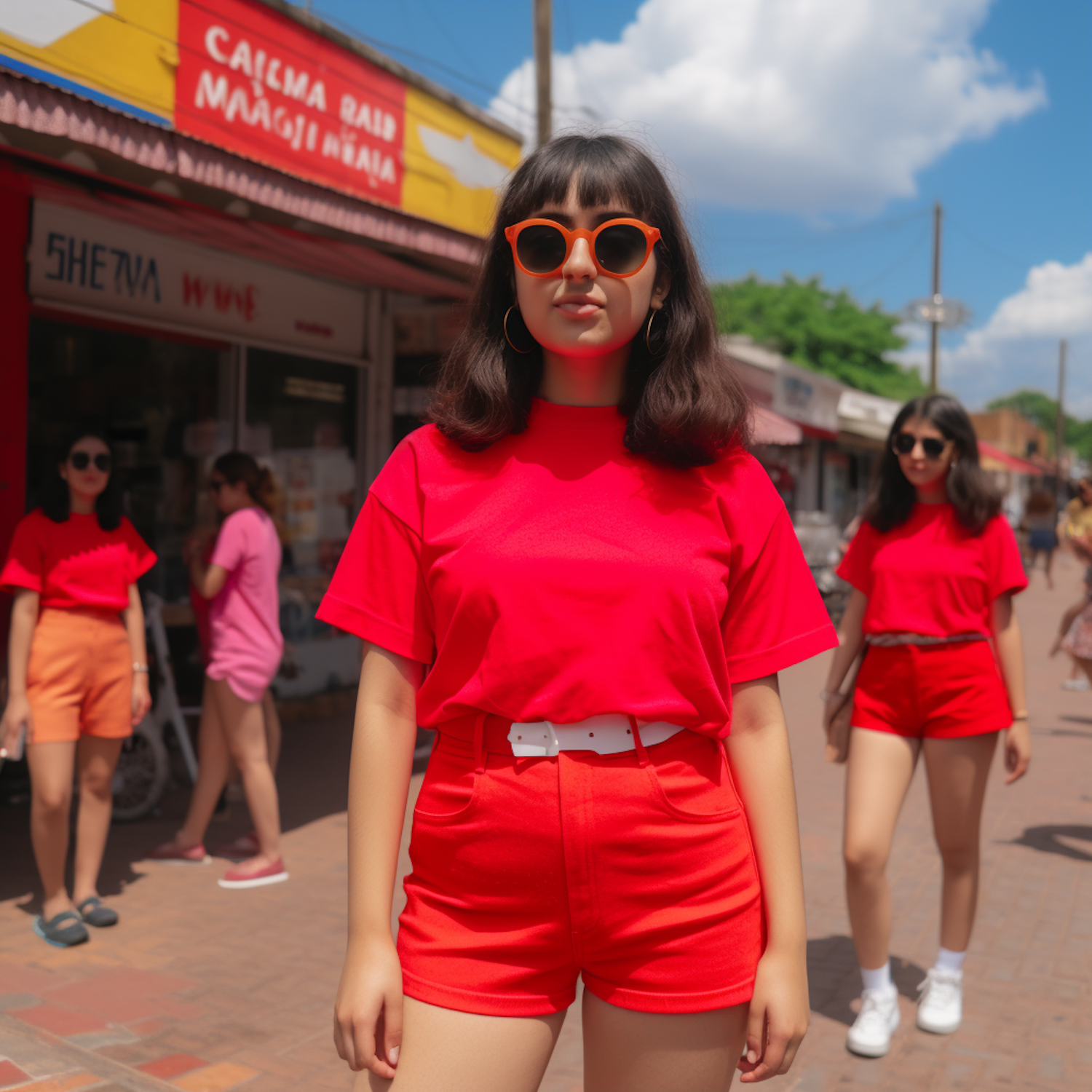 Confident woman in red outfit with orange sunglasses on a sunny street, surrounded by friends in vibrant summer attire.