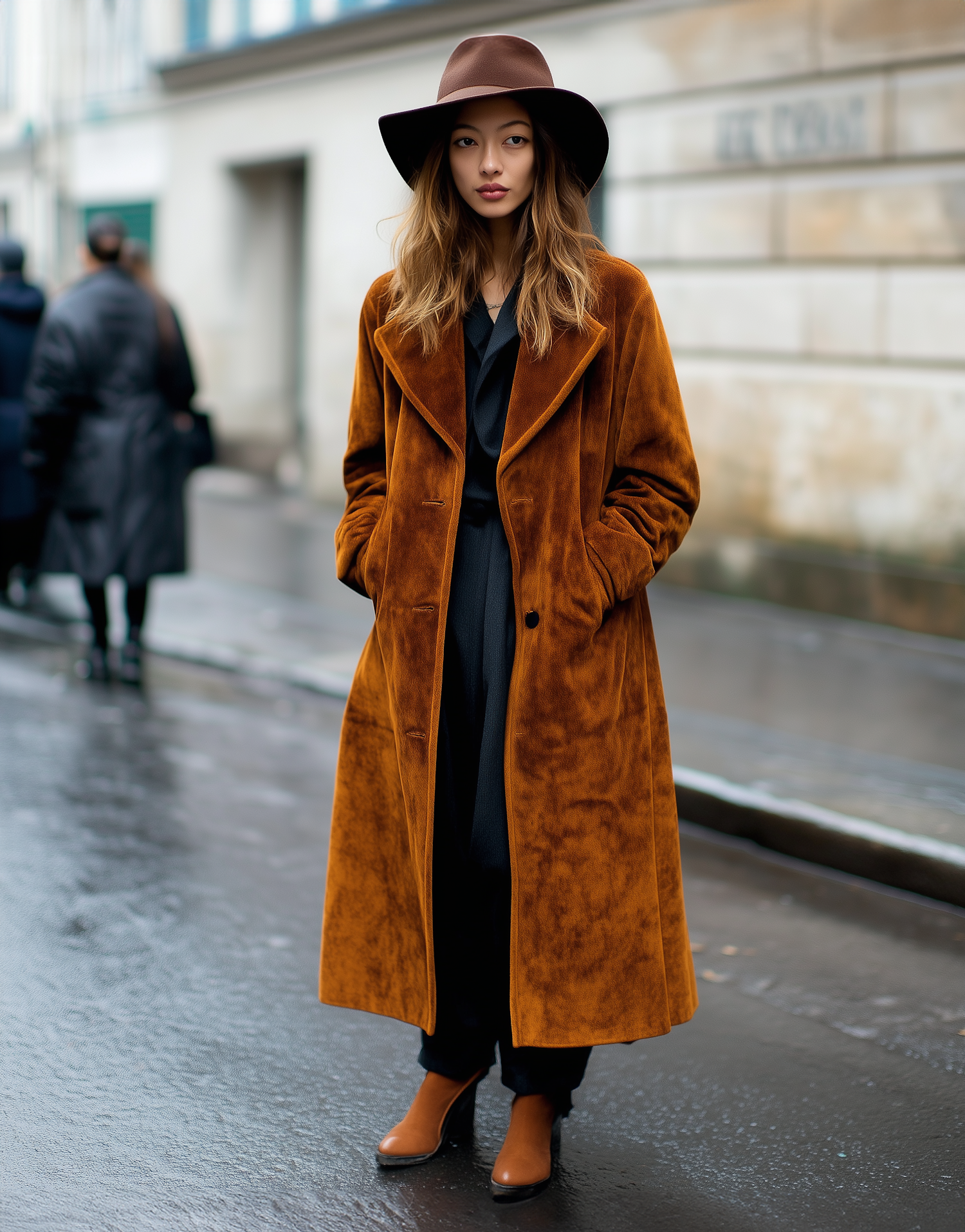 Chic street style featuring a rust suede coat, wide-brimmed hat, and tan boots on a rainy urban day. Perfect blend of elegance and edge.