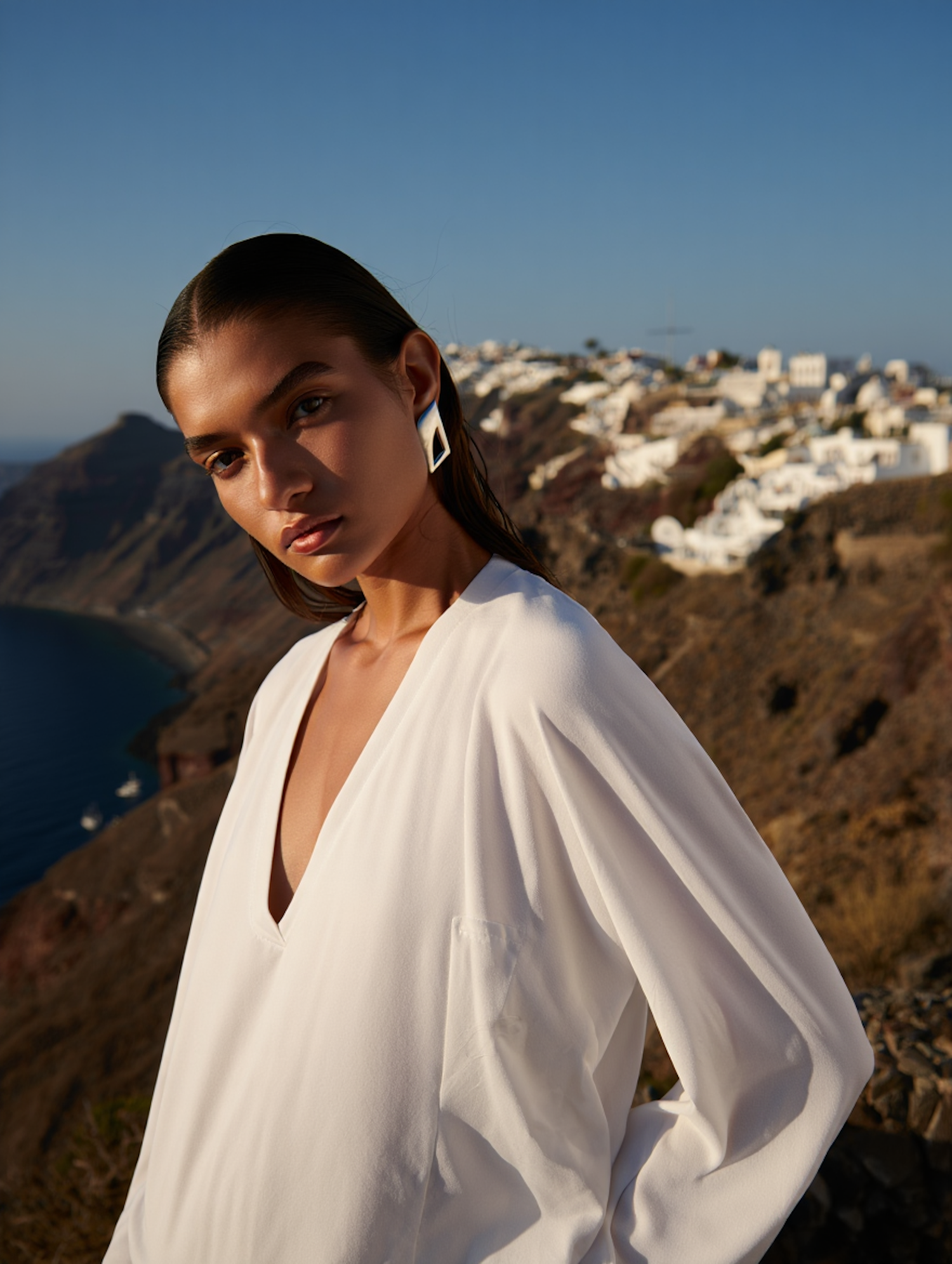 Stylish woman in white top with geometric earrings, posing against a stunning Mediterranean coastal town backdrop at sunset.