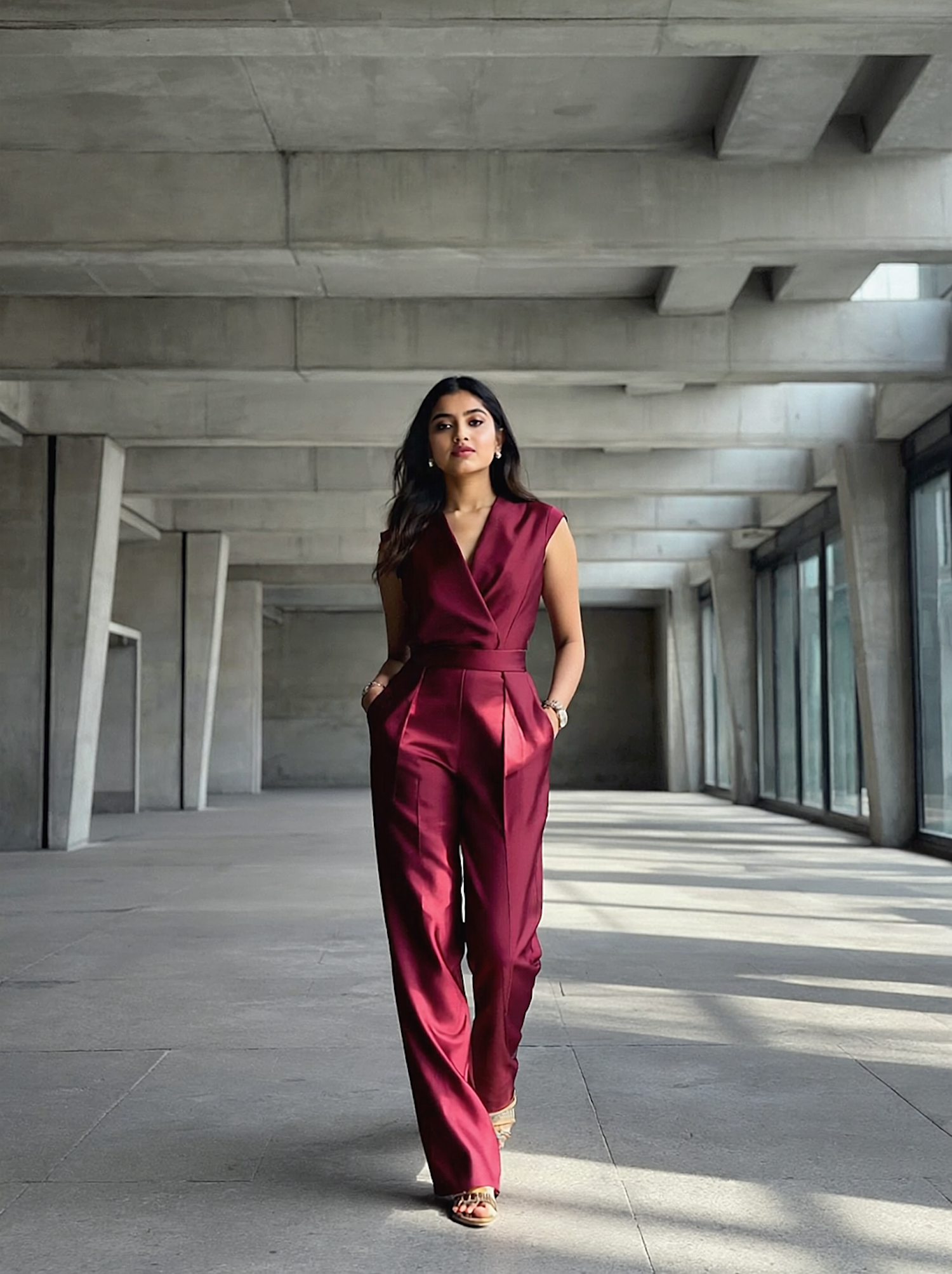 Stylish woman in a burgundy satin jumpsuit walking in a modern concrete space with glass windows and dramatic lighting.