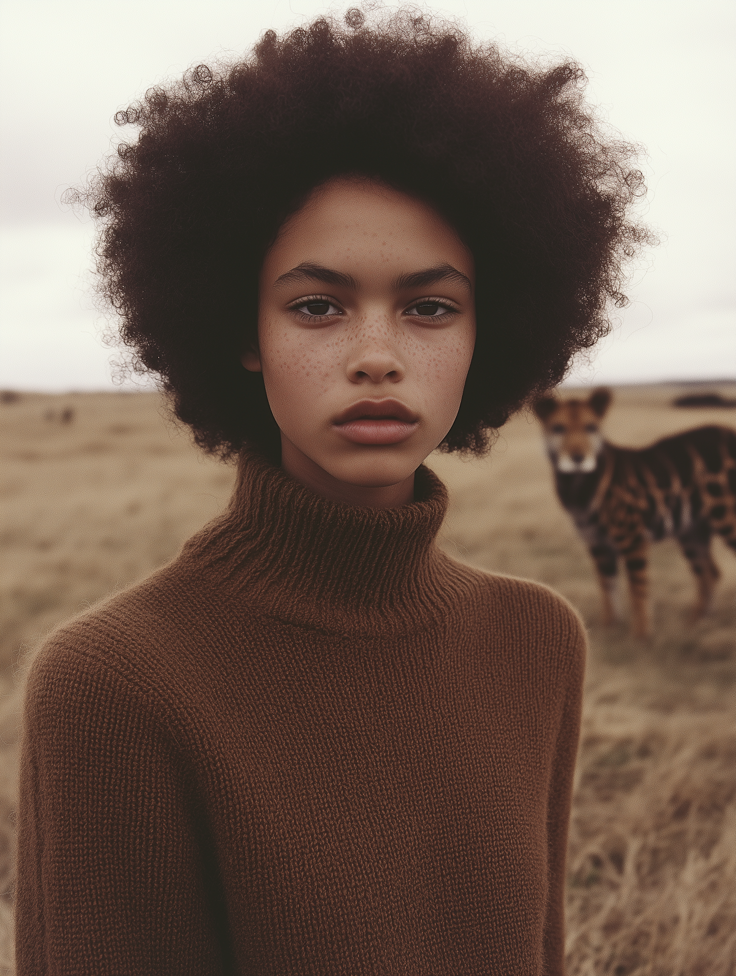 A serene portrait of a freckled woman in a brown sweater with a savanna backdrop and a cheetah-like animal in the distance.