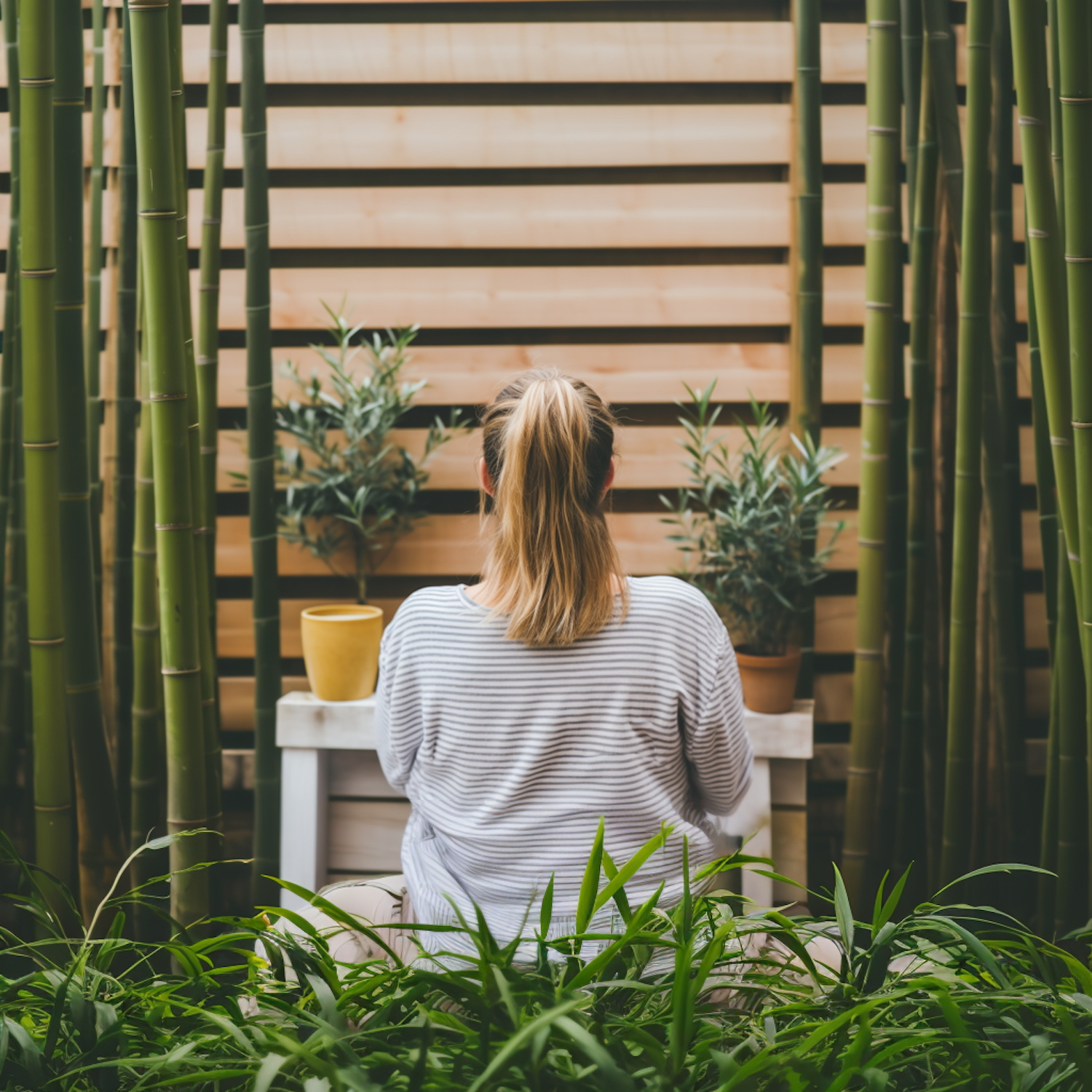 Woman in striped shirt sits on a bench surrounded by bamboo and potted plants, creating a serene garden atmosphere.