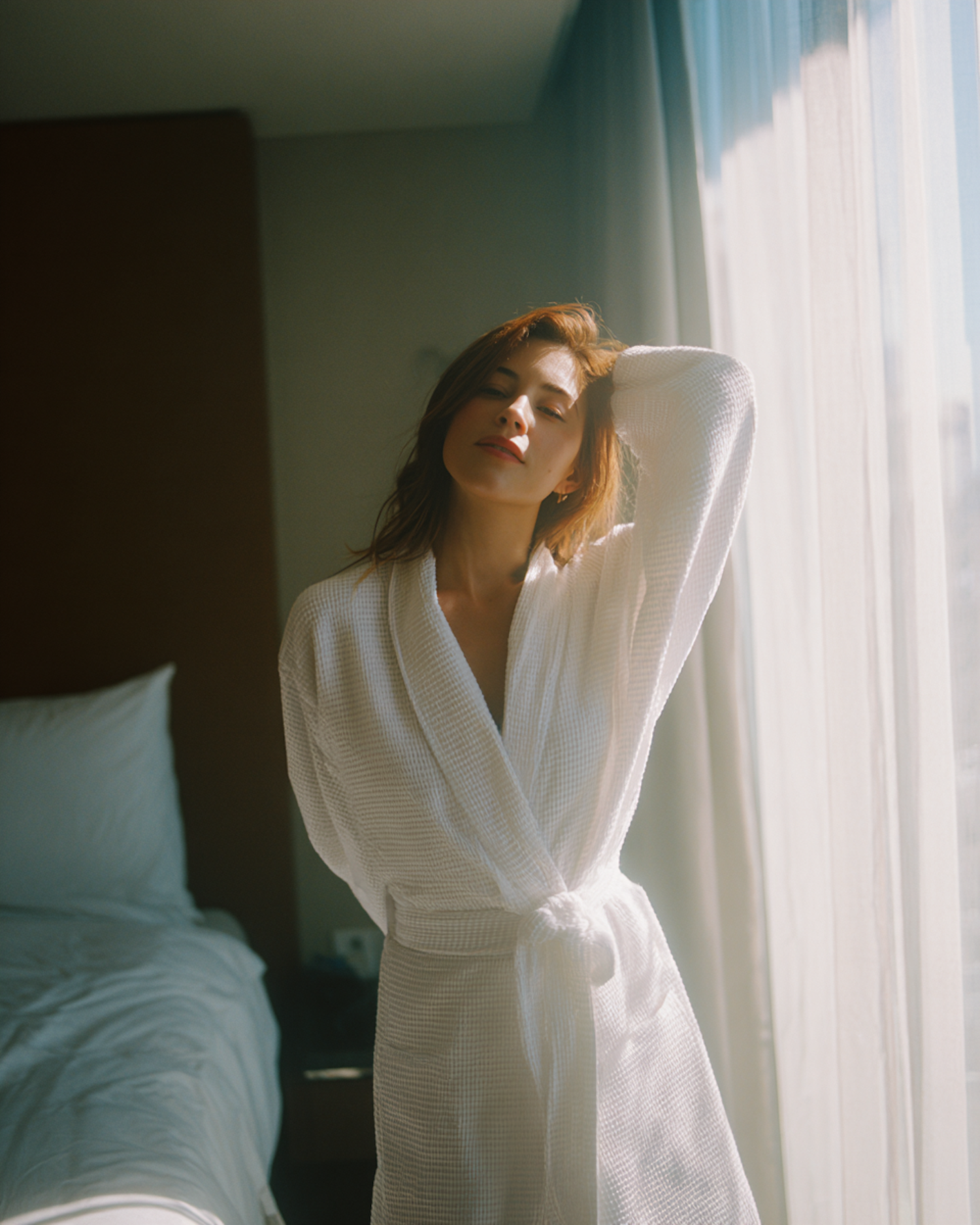 A serene moment of a woman in a white bathrobe, standing by a sunlit window with a relaxed expression, capturing a peaceful morning vibe.