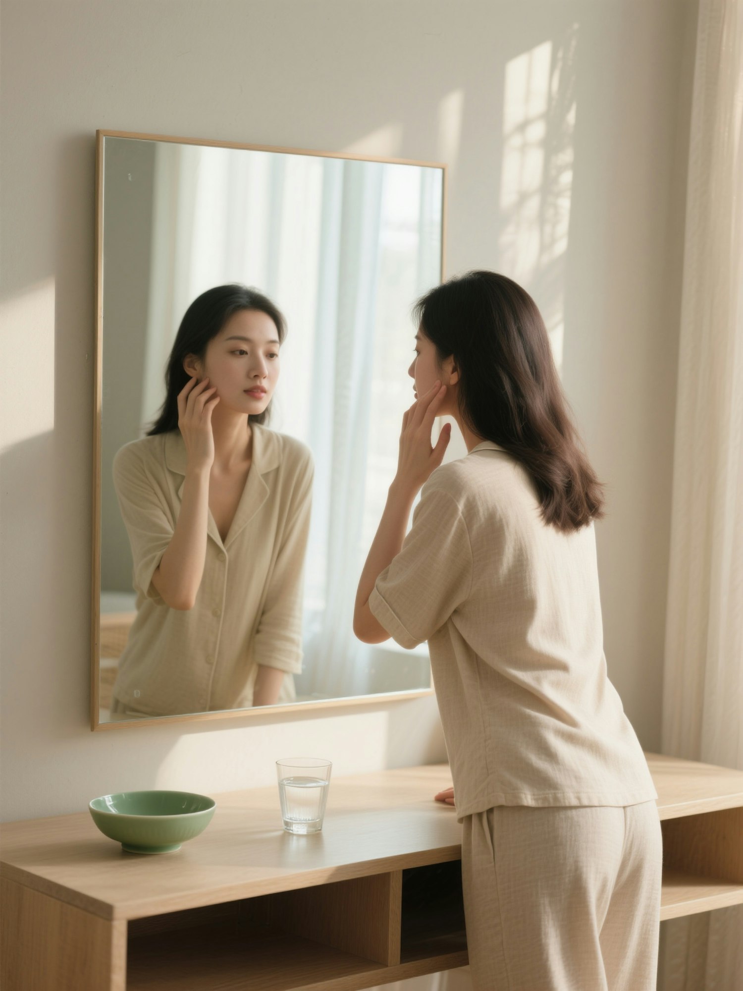 A woman in beige loungewear looks at her reflection in a mirror, standing by a wooden table with a green bowl and a glass of water.