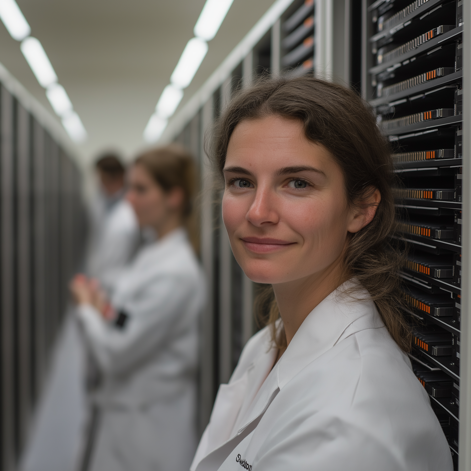 Confident woman in a server room, wearing a lab coat, surrounded by technology. Professional and focused atmosphere.