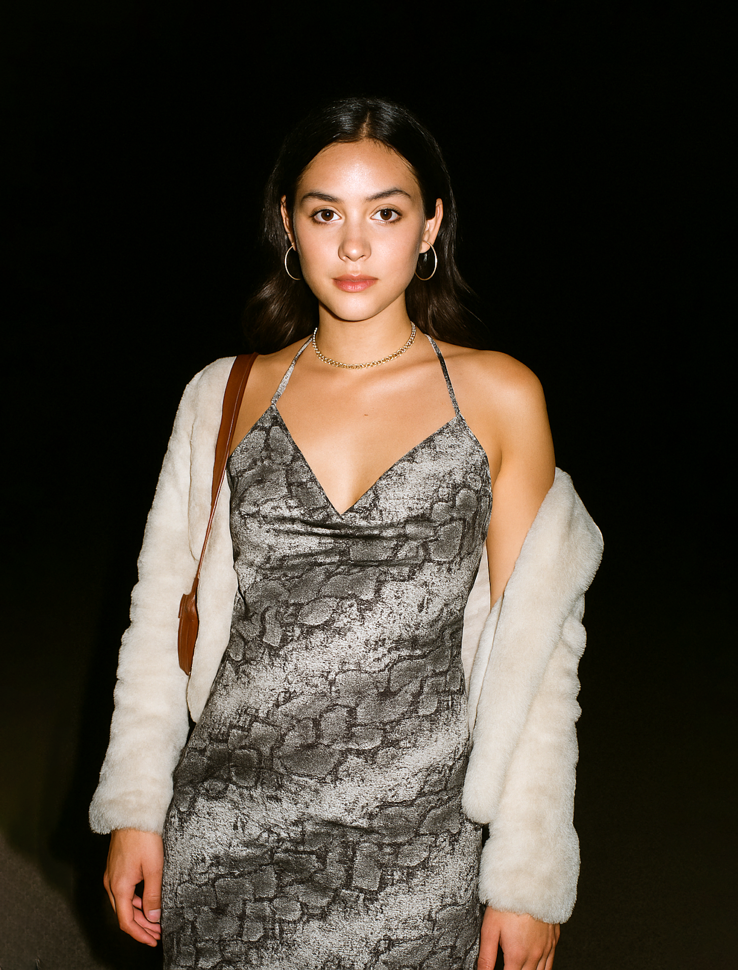 Stylish woman in a snakeskin dress and faux fur jacket, accessorized with hoop earrings and a gold necklace, posing against a black background.