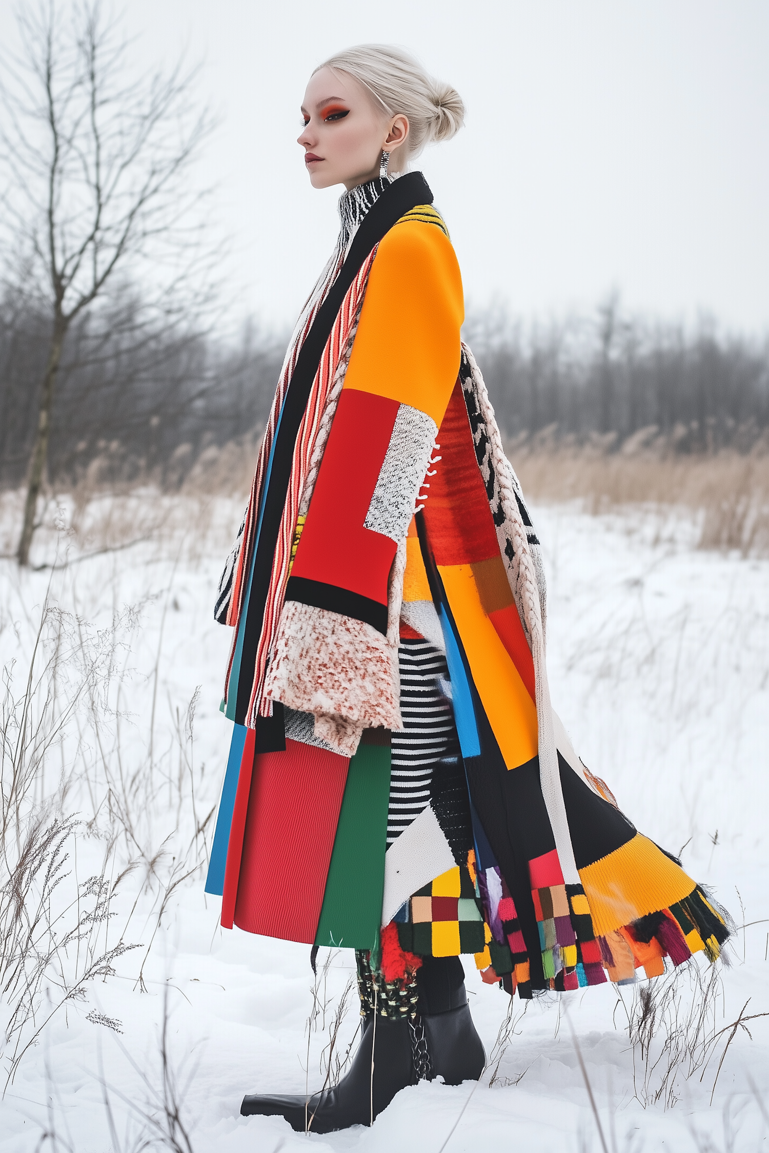 A woman in a vibrant patchwork coat stands in a snowy field, her bold makeup and colorful outfit contrasting the wintry landscape.