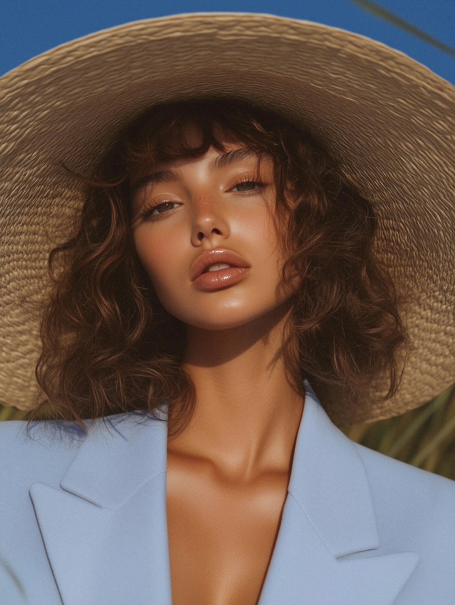 Stylish woman in a straw hat and blue blazer against a clear blue sky, exuding a serene and summery vibe.