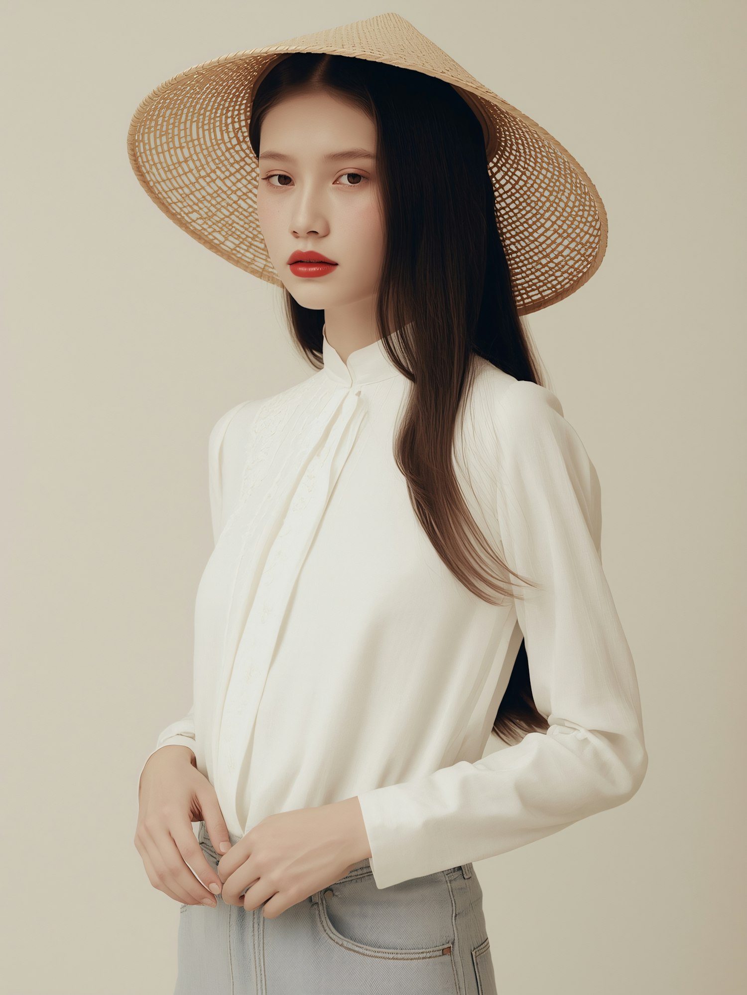 Elegant woman in a white blouse and straw hat, exuding a serene vibe against a neutral beige background.