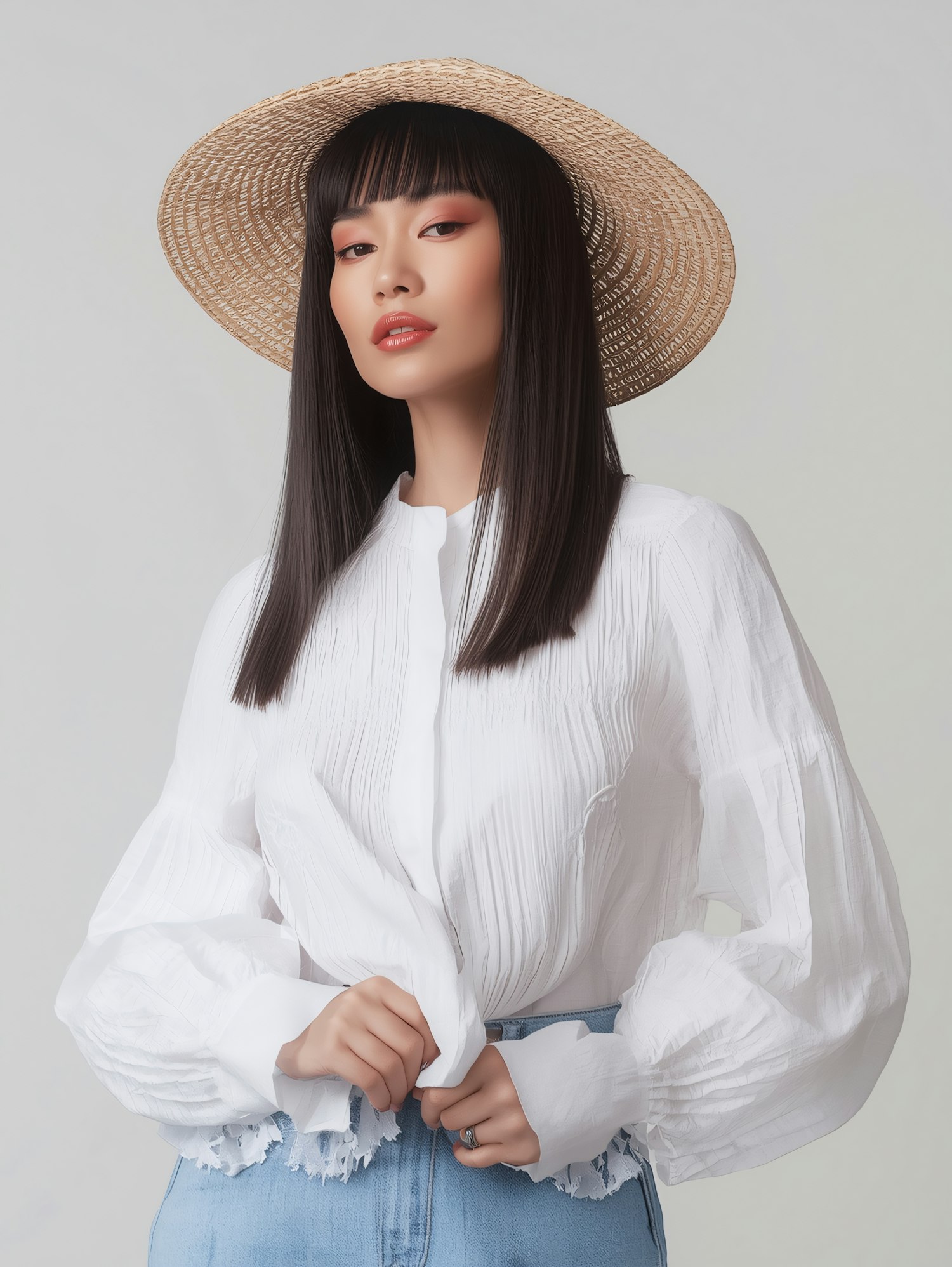 Stylish woman in a straw hat, white blouse, and denim jeans, posing against a light background. Perfect for fashion inspiration.