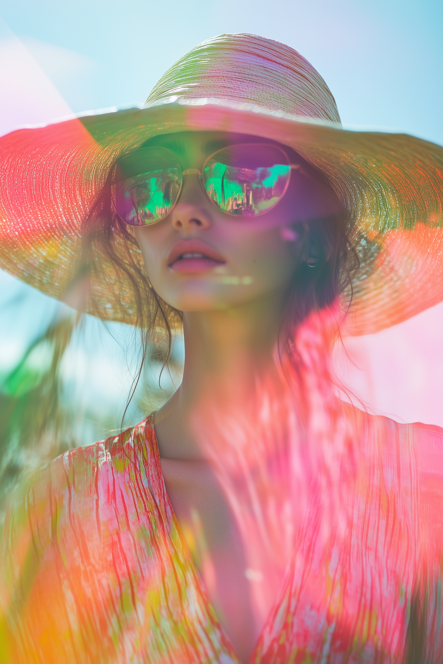 A stylish woman in a straw hat and reflective sunglasses, surrounded by dreamy rainbow light flares on a sunny day.