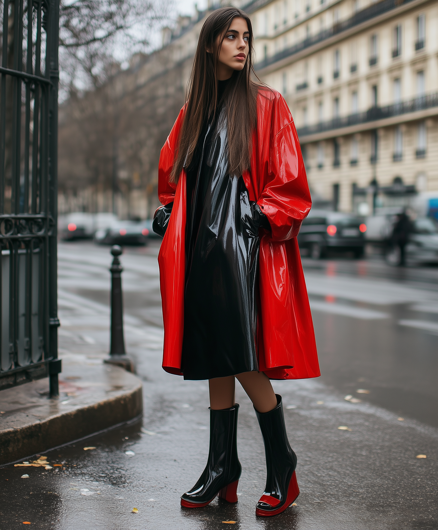 Stylish woman in a red coat and black dress stands on a rainy city street, exuding confidence and elegance.