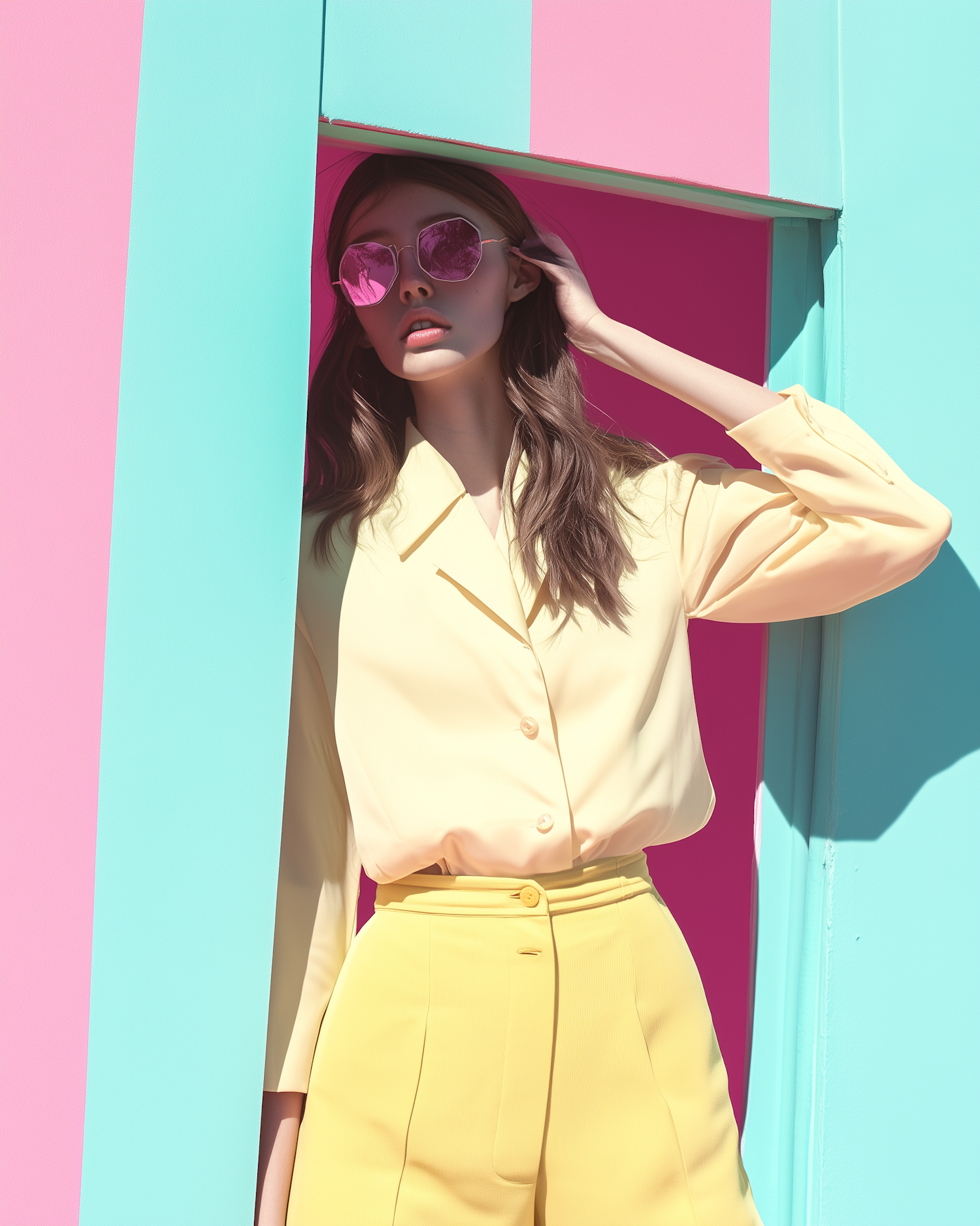 Stylish woman in yellow outfit with pink sunglasses against vibrant pink and turquoise striped background.