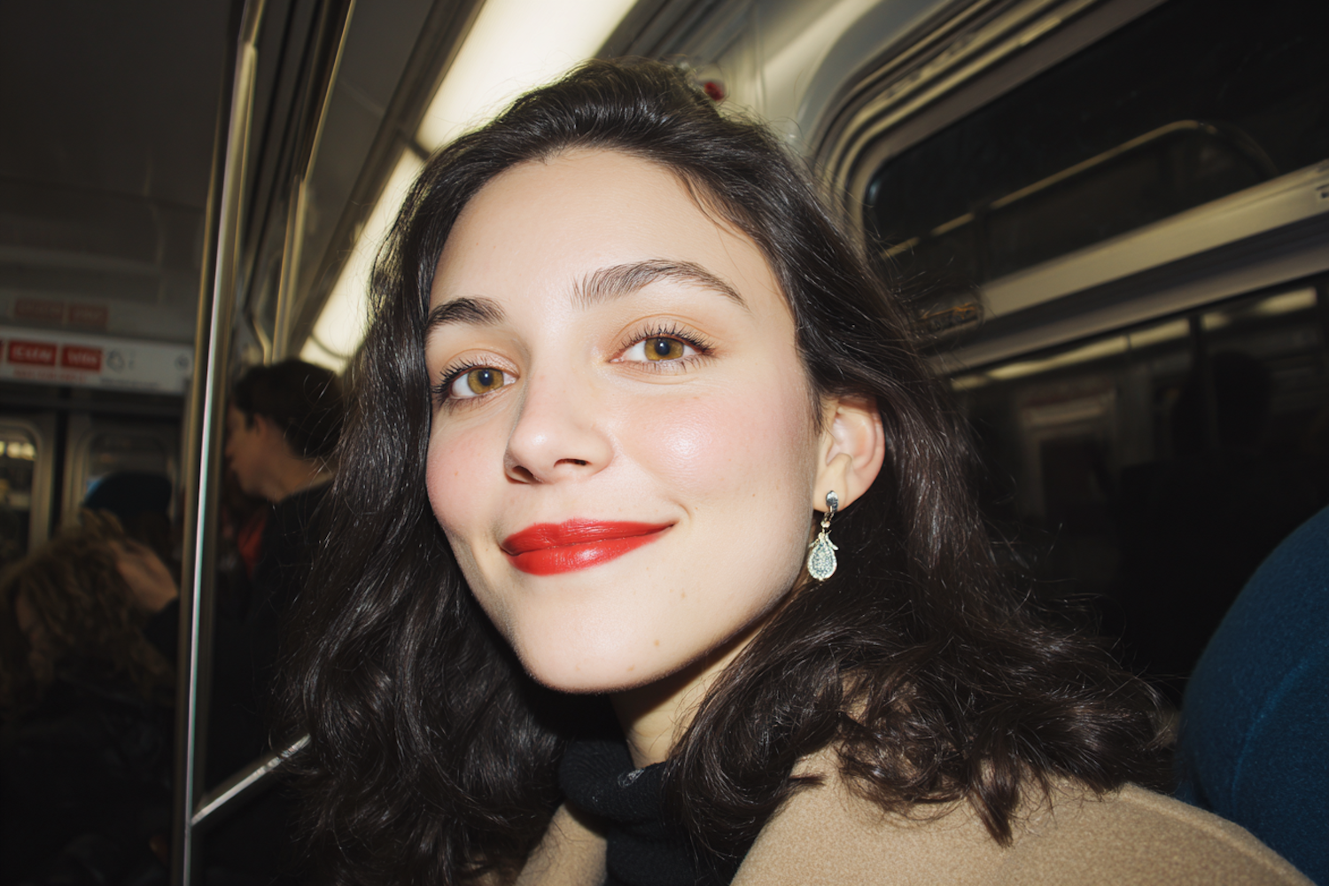 A young woman with red lipstick and earrings smiles warmly while seated in a subway car, surrounded by a casual urban setting.