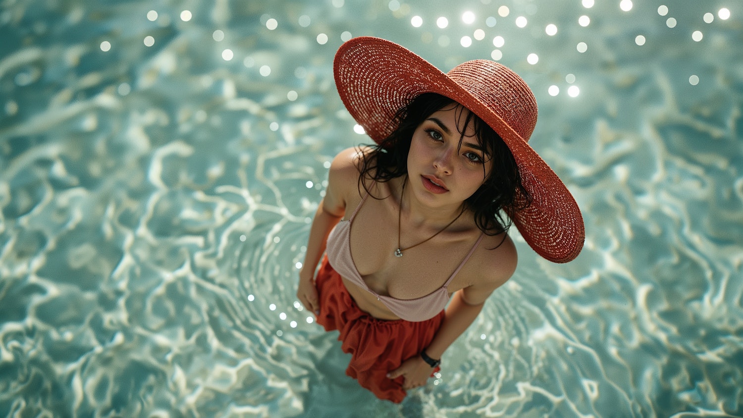 A woman in a red sun hat and summer outfit enjoys a serene moment in sparkling water under the sunlight. Captivating summer vibe.
