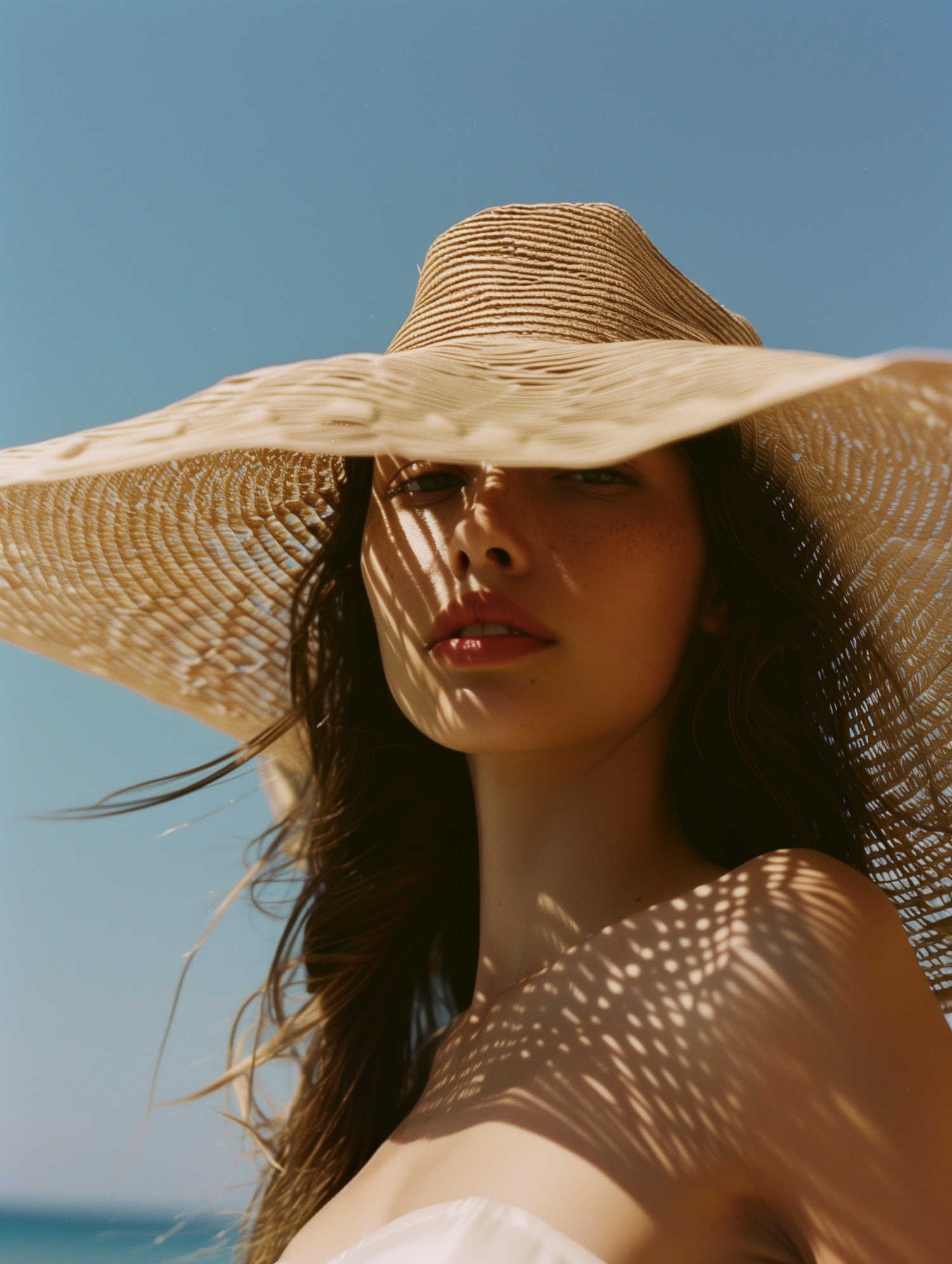 A serene woman in a straw hat casts shadows on her face against a clear blue sky, evoking a warm, summery beach vibe.