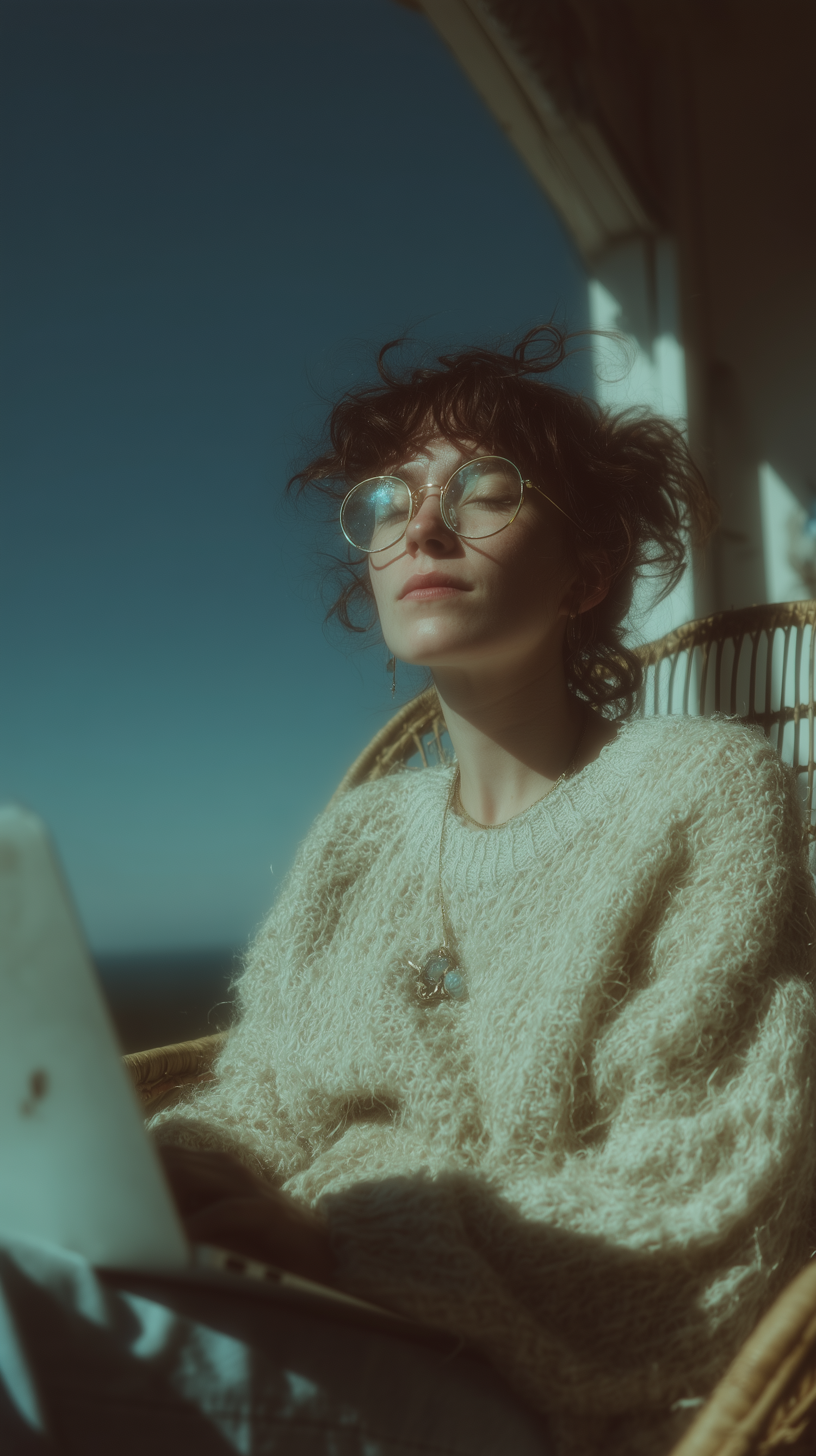 A woman in a cozy sweater and glasses enjoys the sunlight outdoors, sitting with a laptop under a clear blue sky.