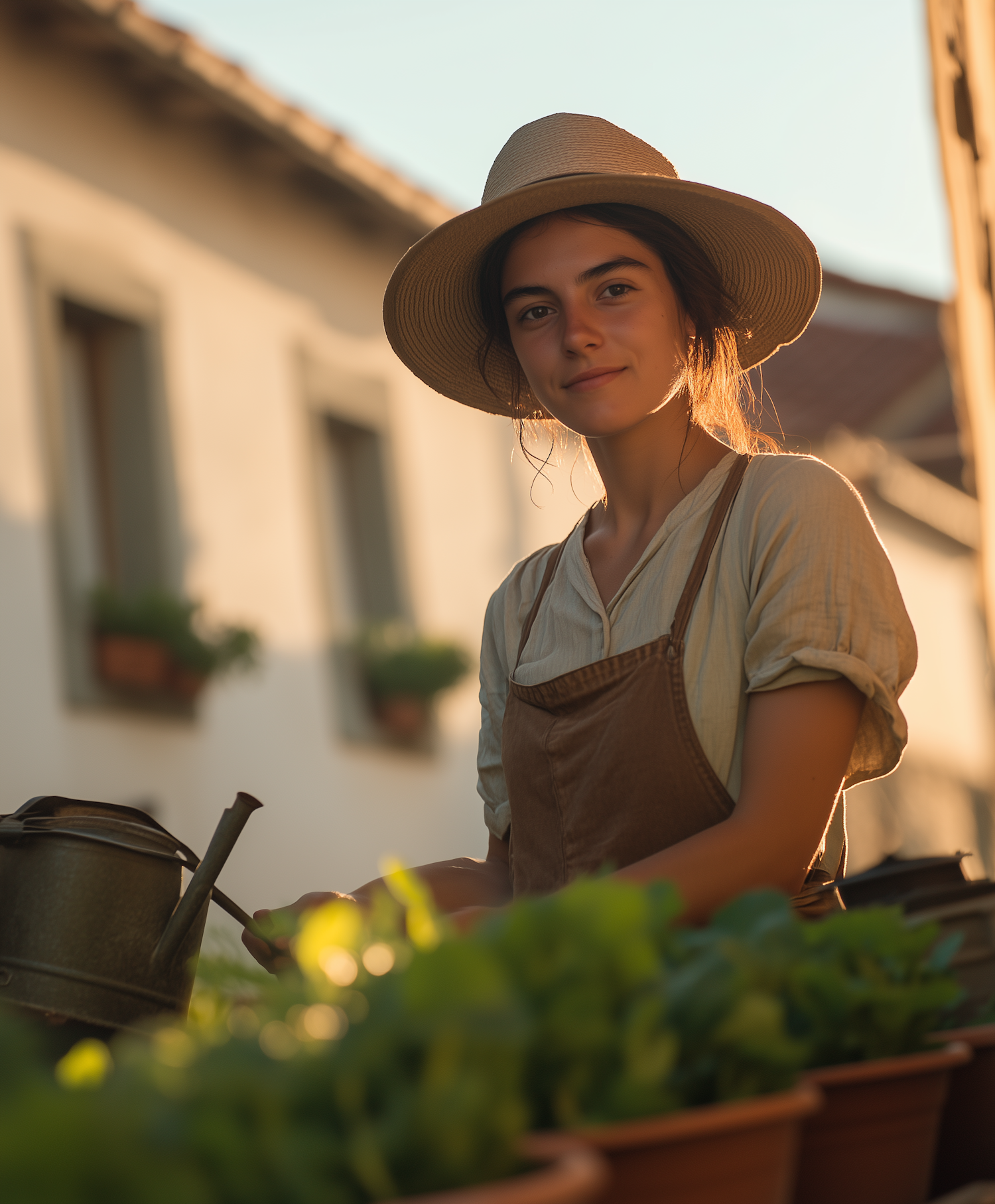 Young woman gardening in warm sunlight, wearing a straw hat and apron, with potted plants and a watering can in a rural setting.
