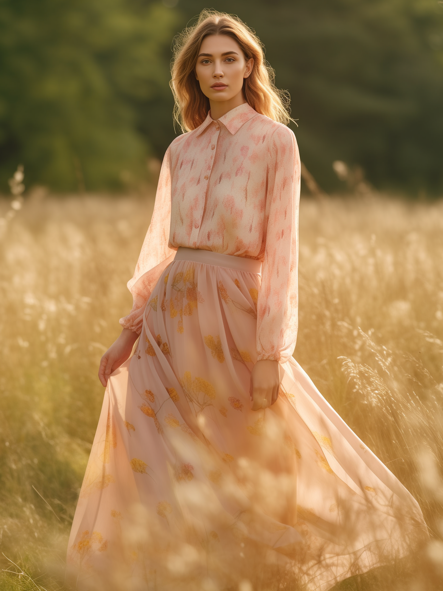 A serene woman in a flowing pastel pink floral dress stands in a sunlit meadow, surrounded by golden grass and soft greenery.