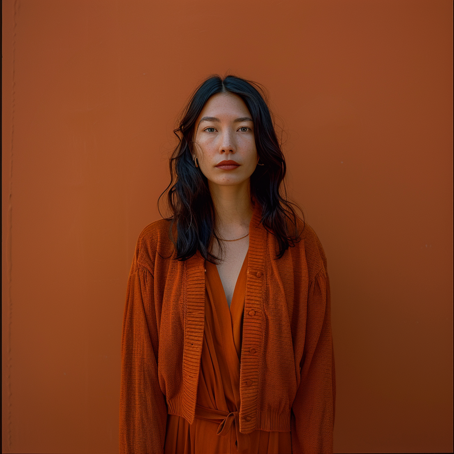 Asian woman in rust-colored outfit against an orange background, exuding warmth and harmony with her calm expression and wavy hair.