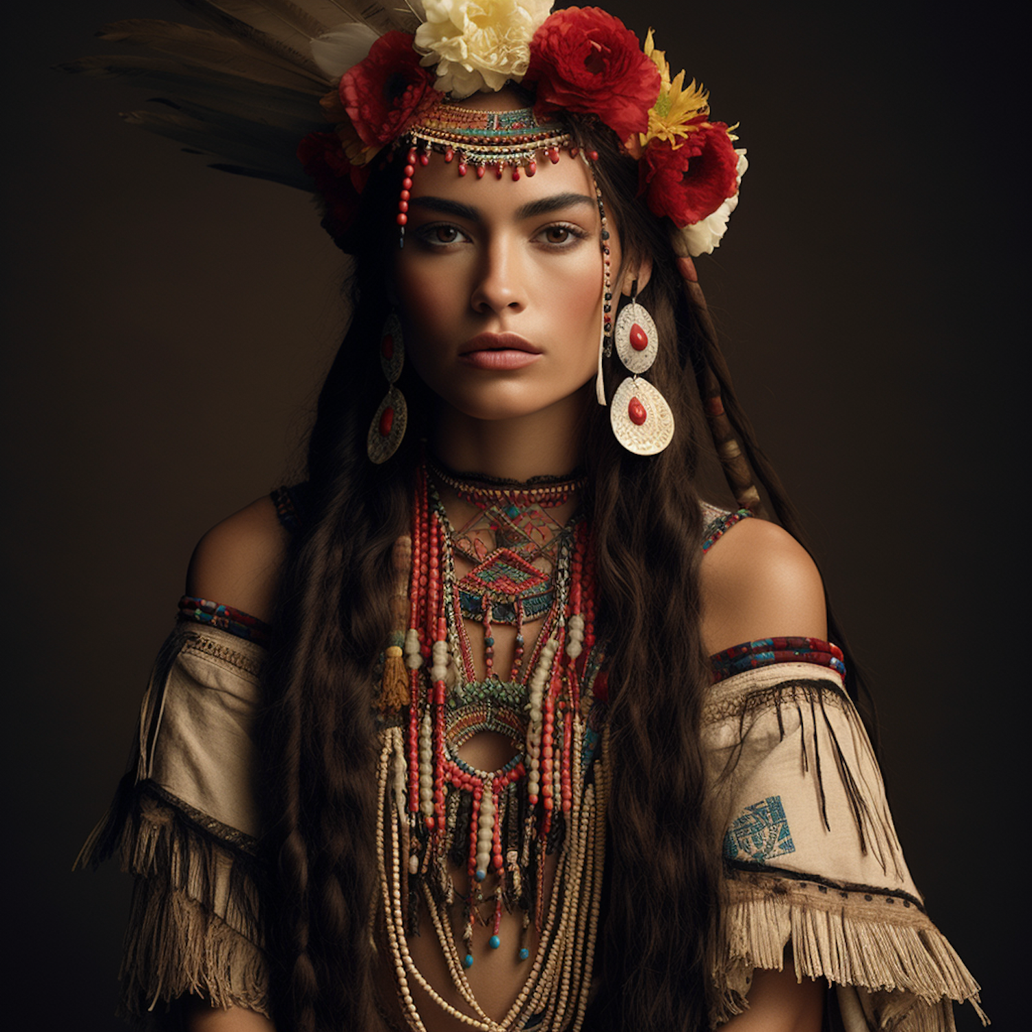 Woman in traditional attire with floral headdress and beaded jewelry, set against a dark background.