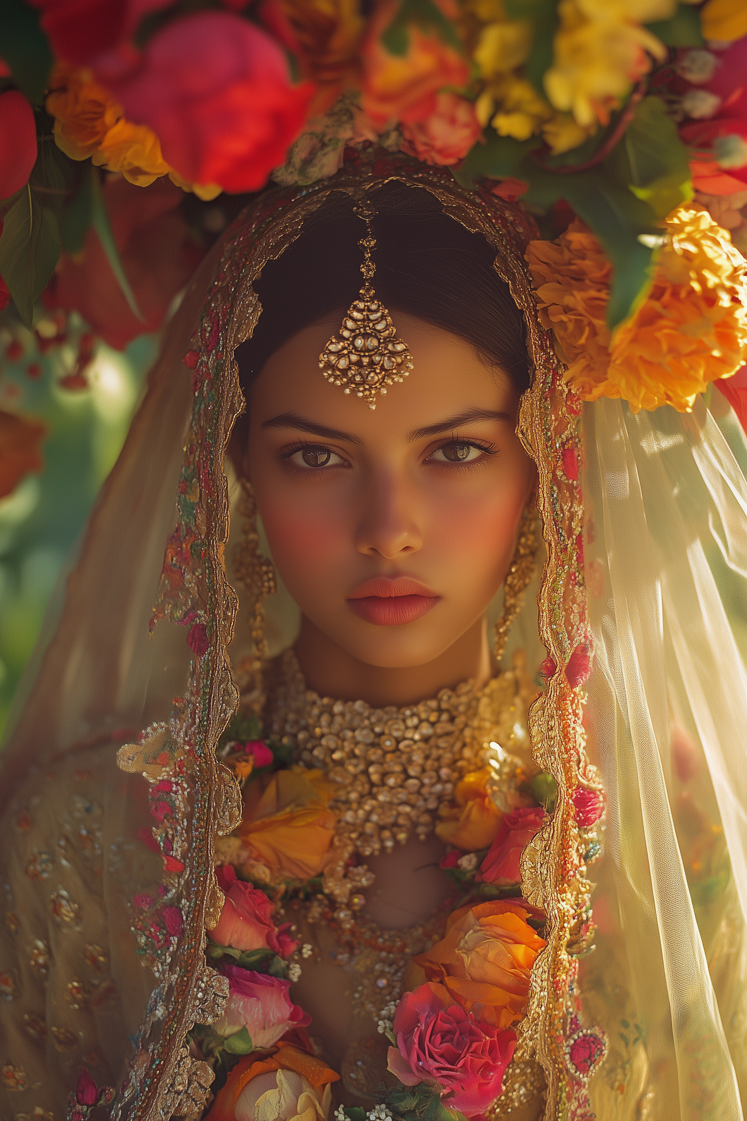 A woman in traditional attire with a floral garland and ornate jewelry, exuding elegance and cultural richness.
