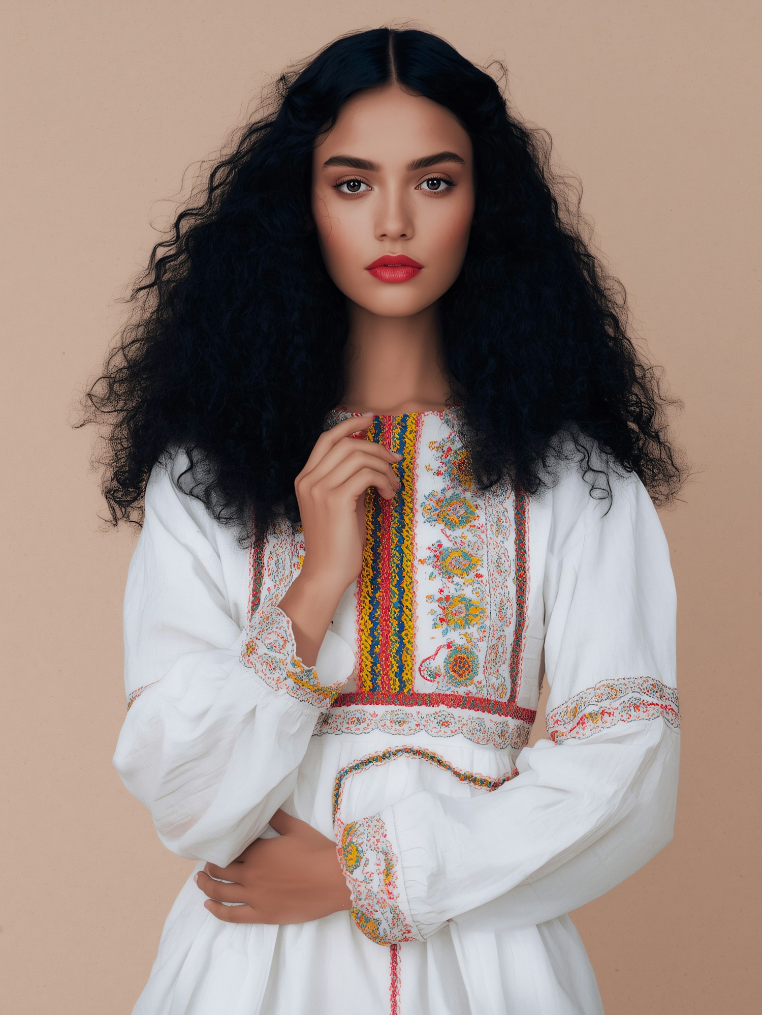 A woman in a traditional white embroidered dress with colorful patterns, posing against a beige background with a calm expression.