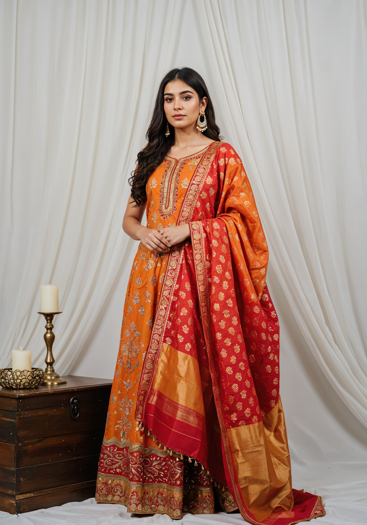 Elegant woman in traditional Indian attire with orange dress and red dupatta, standing against a white draped background.