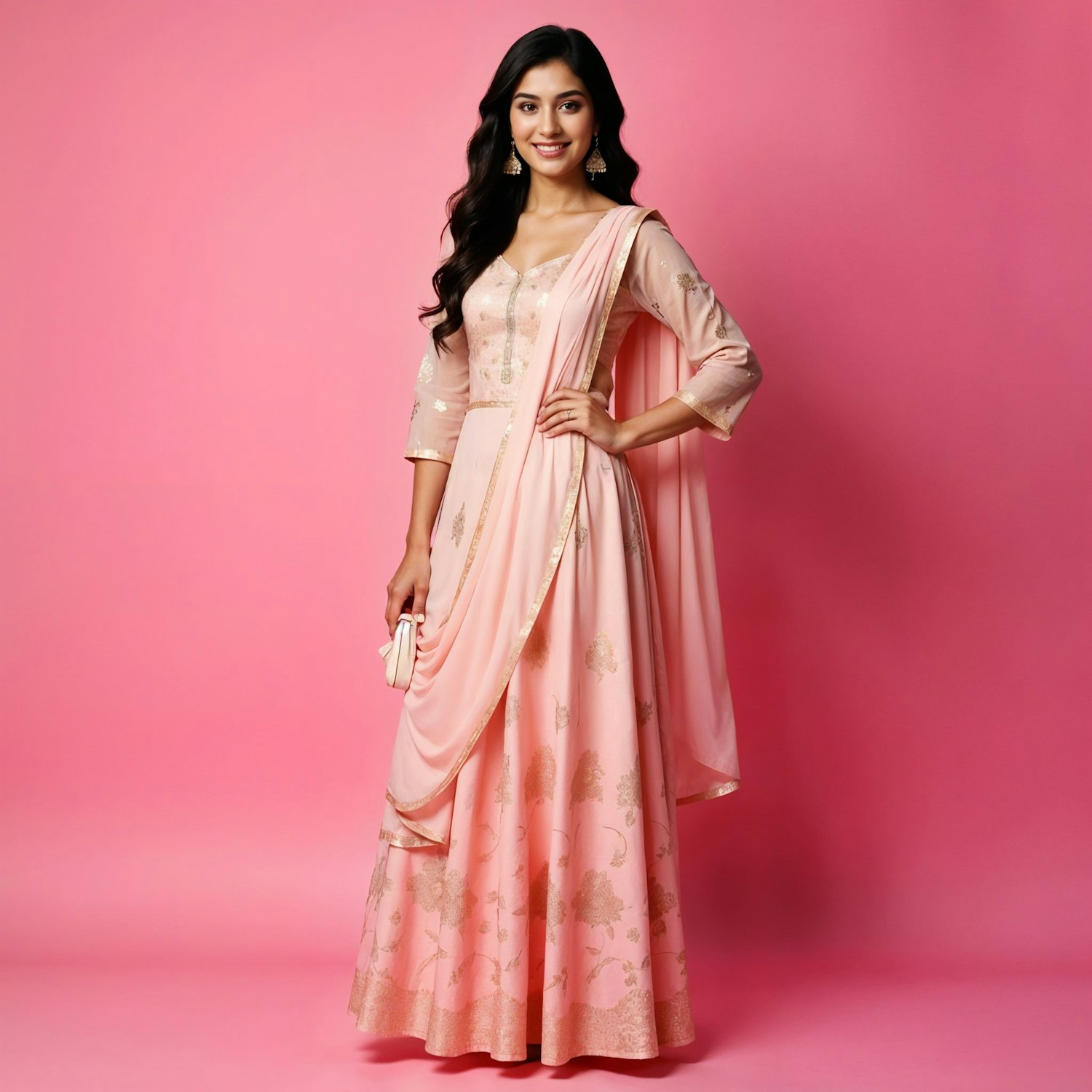 Woman in a pink Anarkali dress with gold patterns, holding a clutch, against a pink background. Elegant and traditional look.