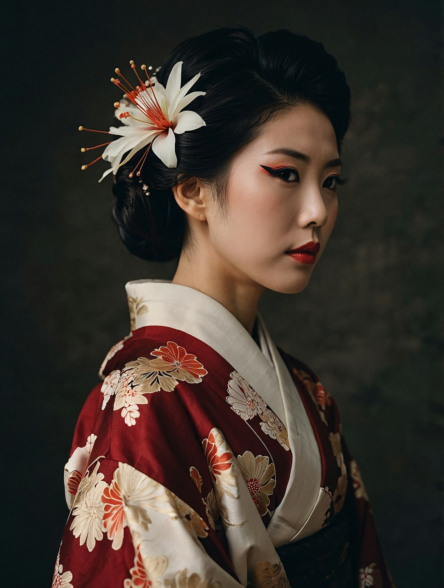 Elegant portrait of a woman in a red floral kimono with striking makeup and a white flower in her hair.