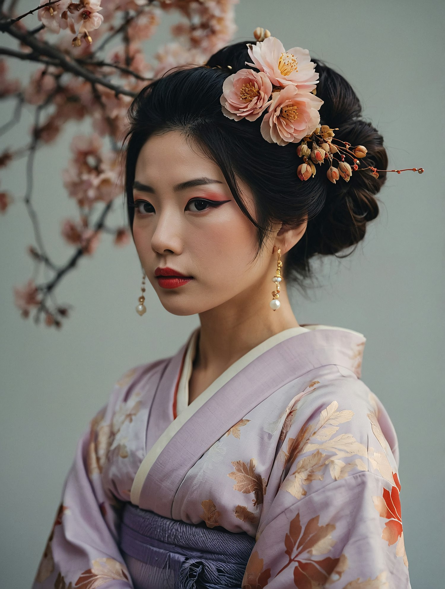 Asian woman in a lavender kimono with floral patterns, adorned with pink flowers in her hair, standing near cherry blossoms.
