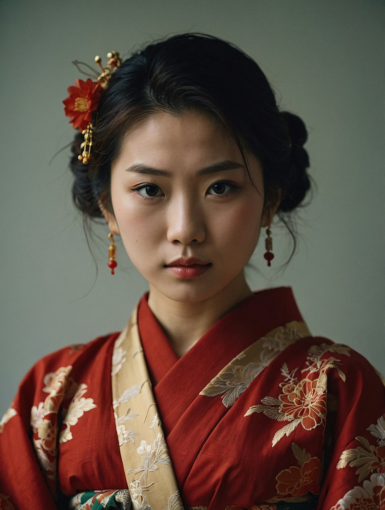 Asian woman in a red kimono with gold floral patterns, adorned with a red flower and gold pins, against a muted green background.