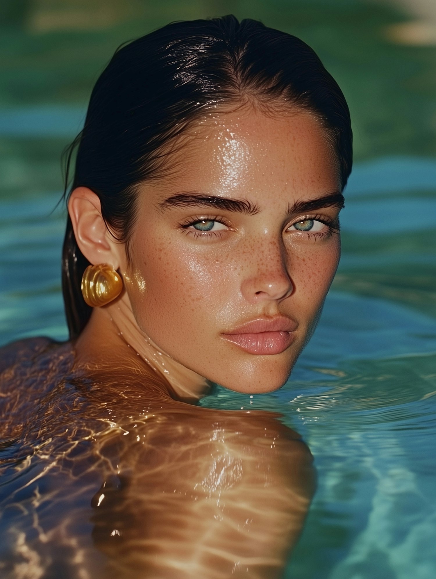 A woman with slicked-back hair and freckles gazes from a pool, her gold earring and shimmering water reflections creating a serene vibe.