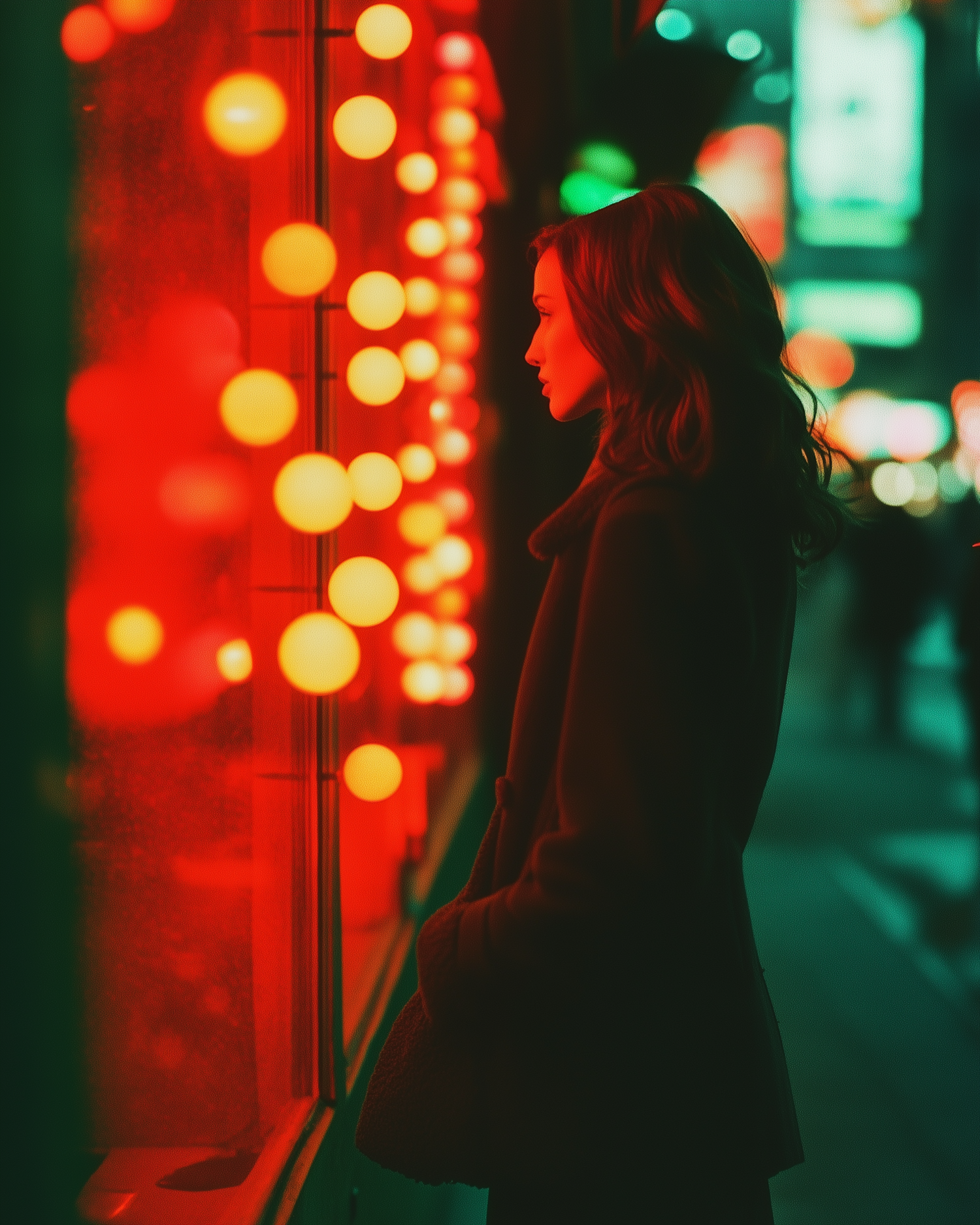 Woman in dark coat gazes at red-lit window display, creating a reflective urban scene with vibrant colors and blurred city lights.
