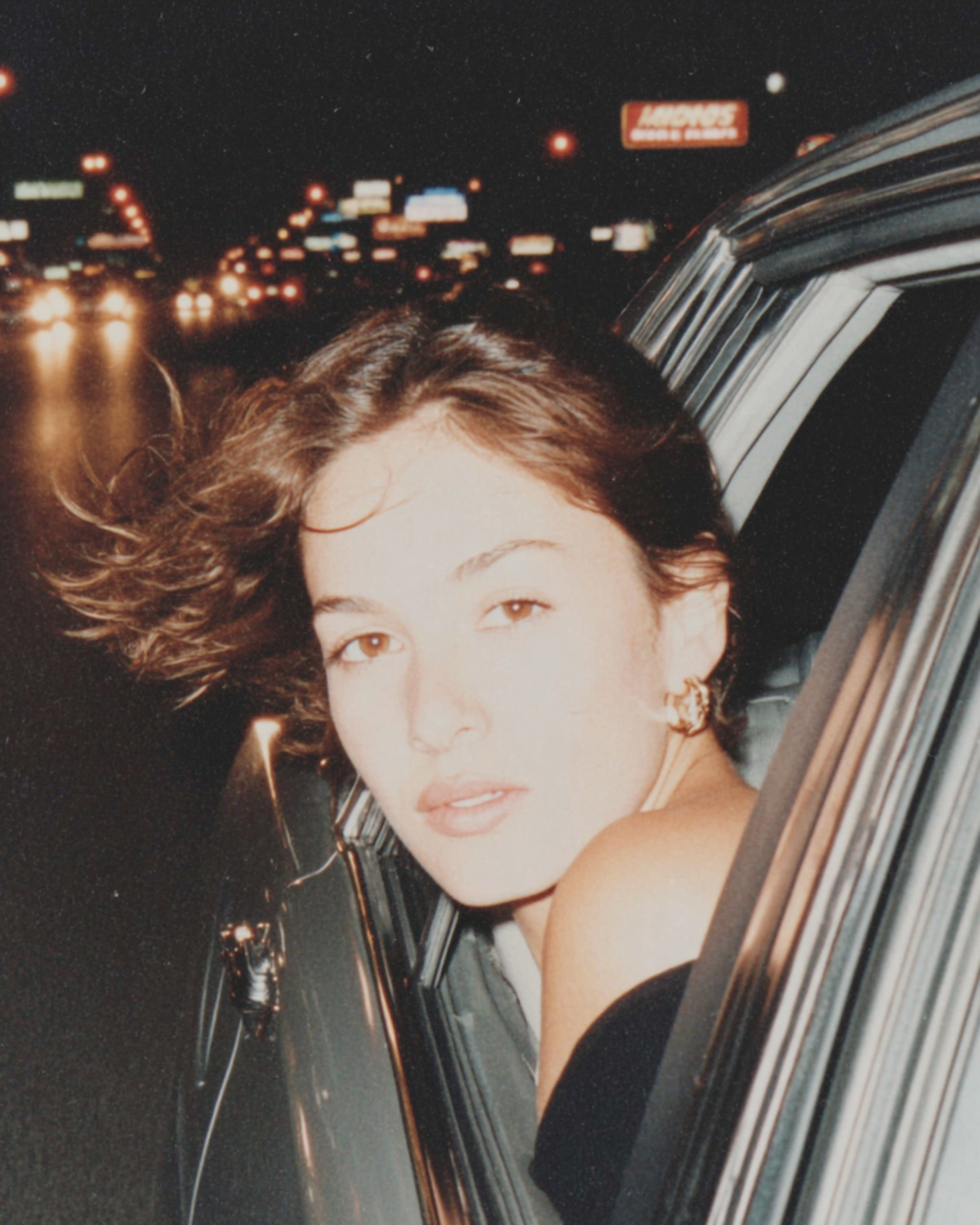 A young woman leans out of a car window at night, her hair tousled, with city lights and street signs glowing in the background.