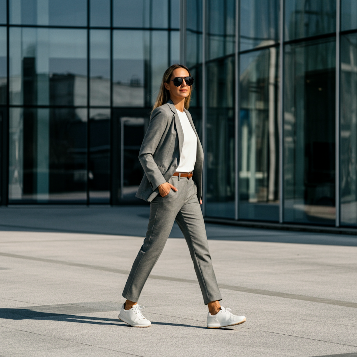 Stylish woman in a gray suit and sneakers walking confidently in a modern urban setting with glass buildings.