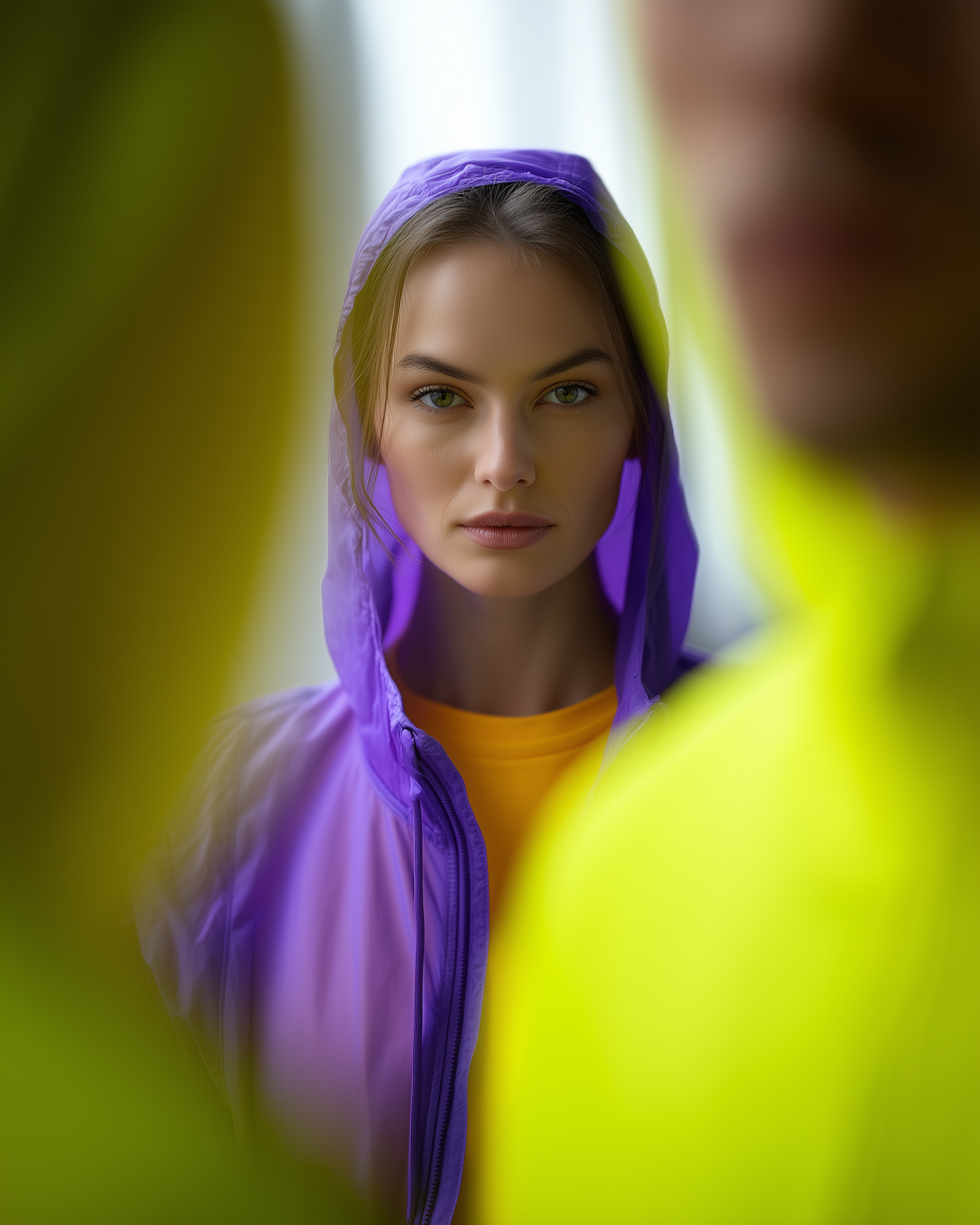 A woman in a purple hooded jacket and yellow shirt stares intently, with blurred neon yellow foreground elements adding depth.