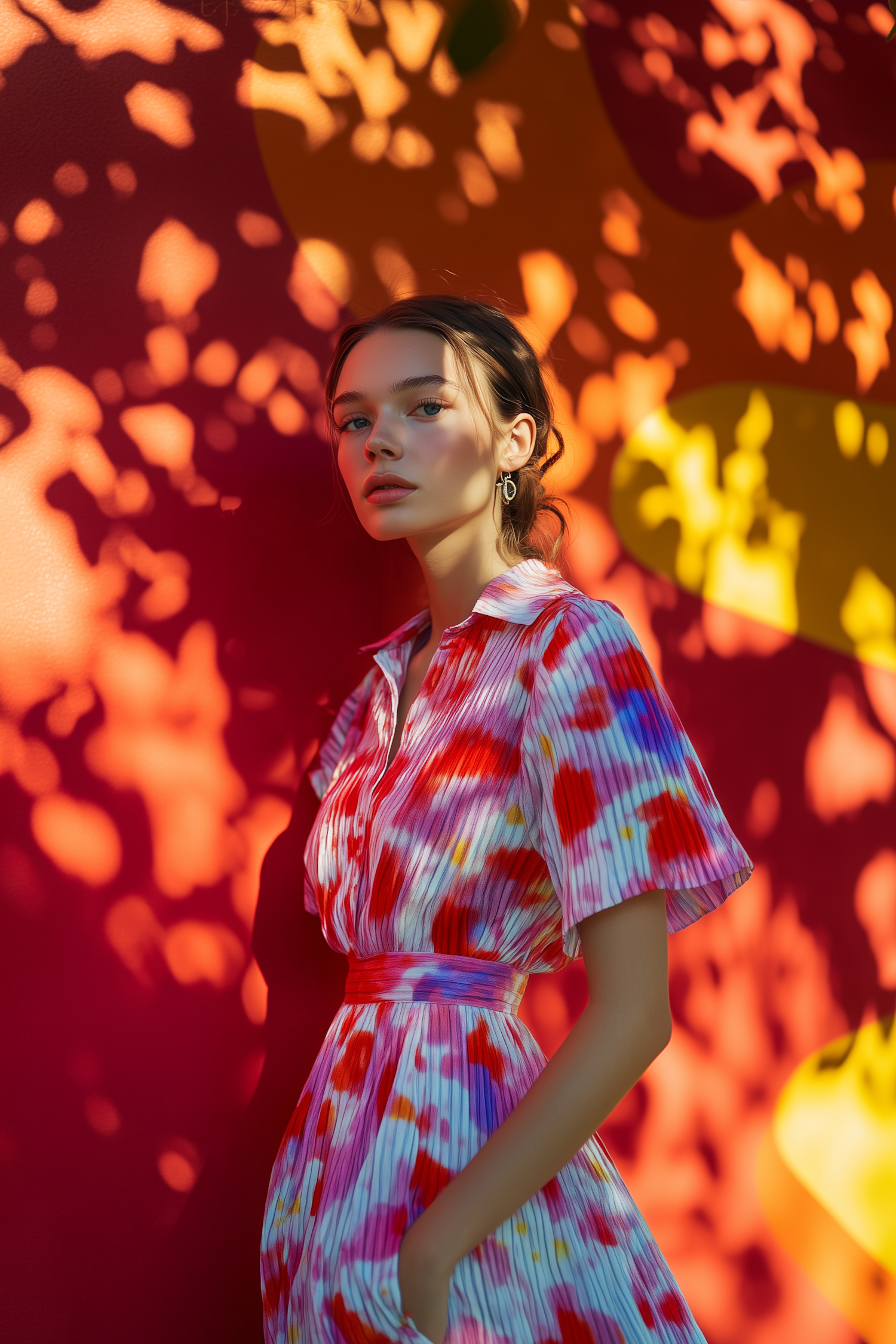 A woman in a colorful pleated dress stands against a vibrant red-orange wall with dappled sunlight and shadow patterns.