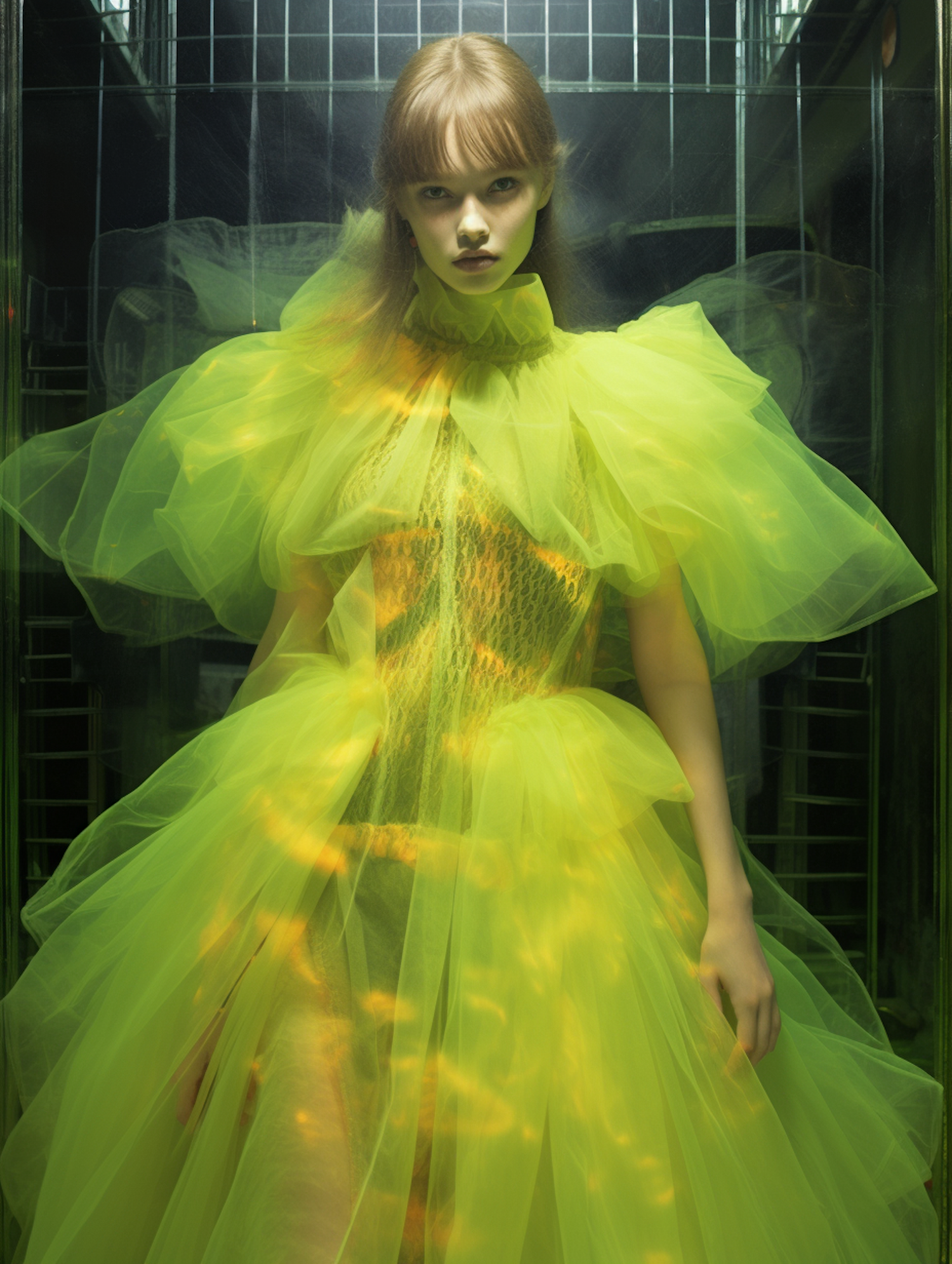 A woman in a neon green tulle dress stands in a dark, grid-like setting, creating a striking contrast and futuristic vibe.
