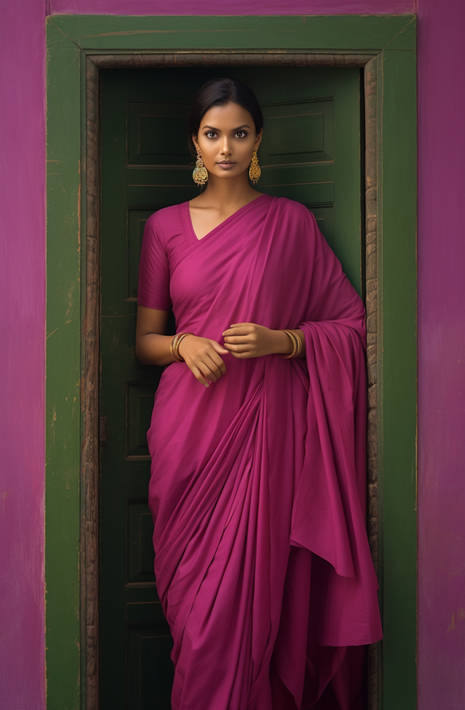 Elegant woman in magenta sari with gold jewelry stands in a green doorway, exuding grace and traditional charm.